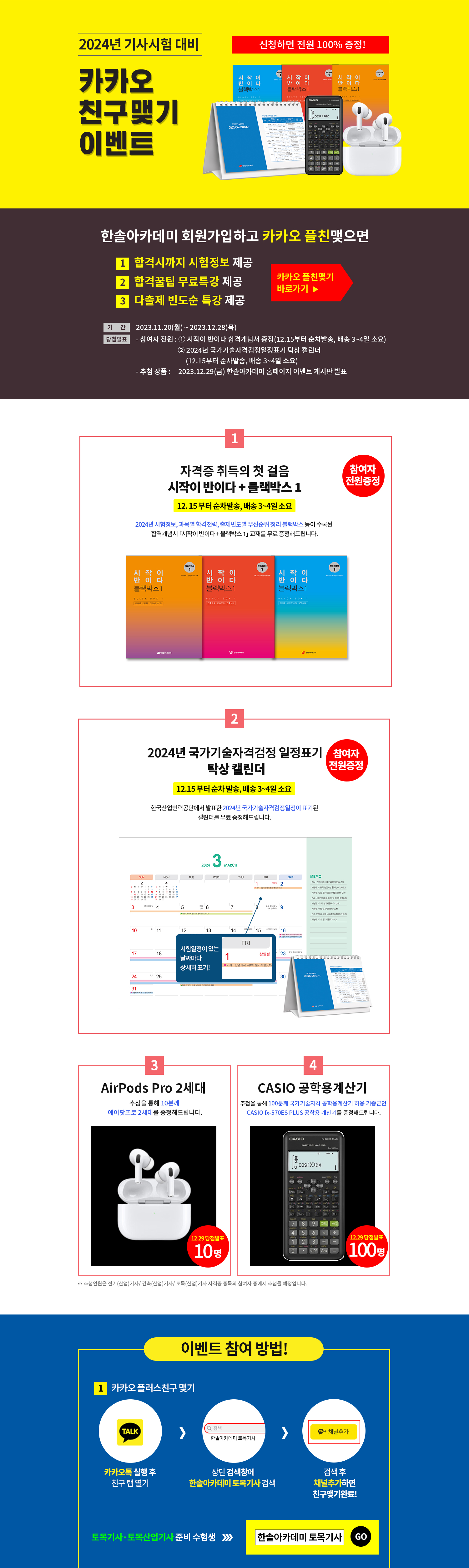 안녕하세요? 한솔아카데미 회원이라면 누구나 참여가능한 카카오친구맺기 이벤트를 오픈합니다! 100% 상품증정은 물론, 카카오친구를 추가하면 2024년 기사자격증 대비 학습관련 알찬 정보를 제공해드릴 예정이오니 많은 참여바랍니다.