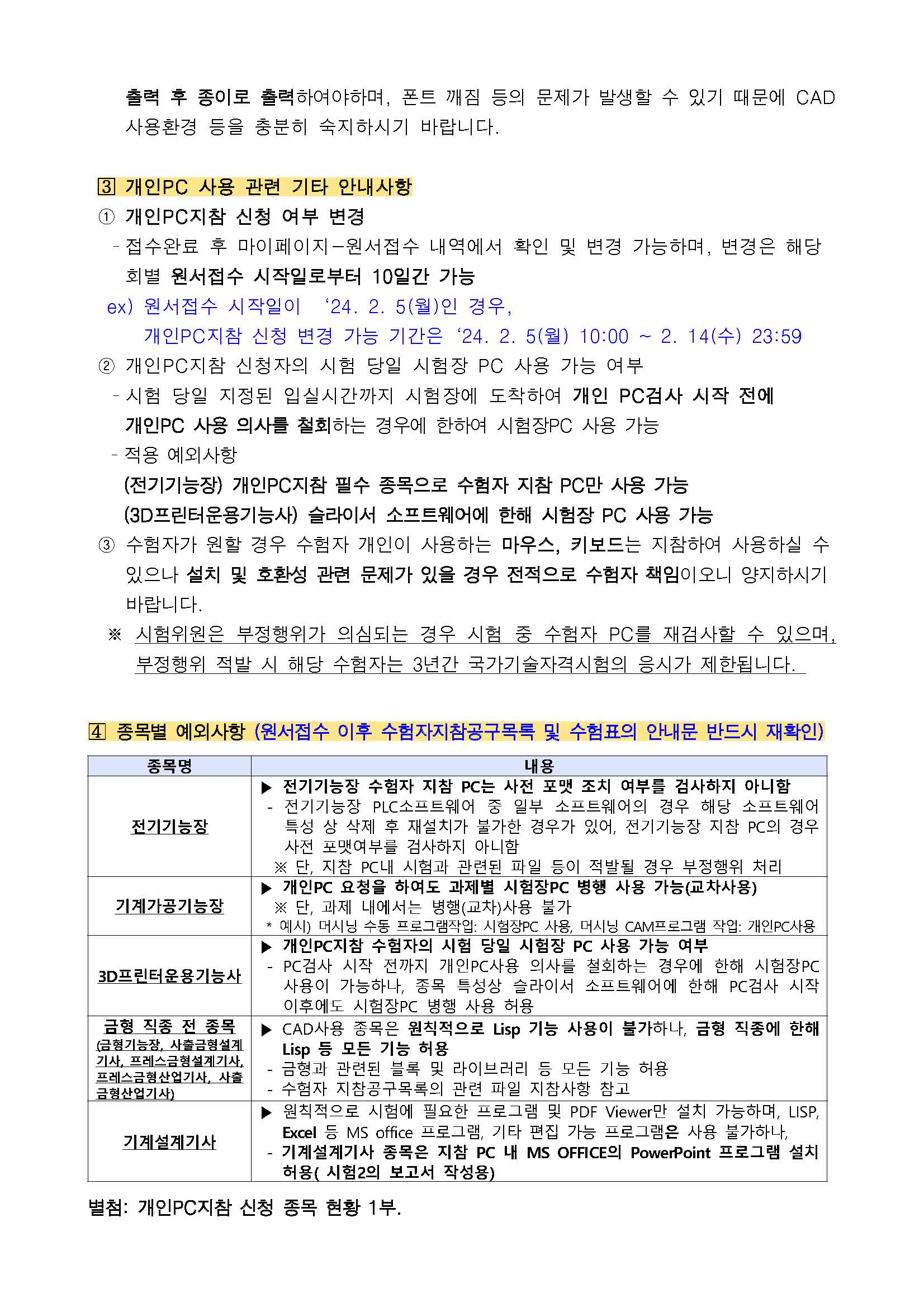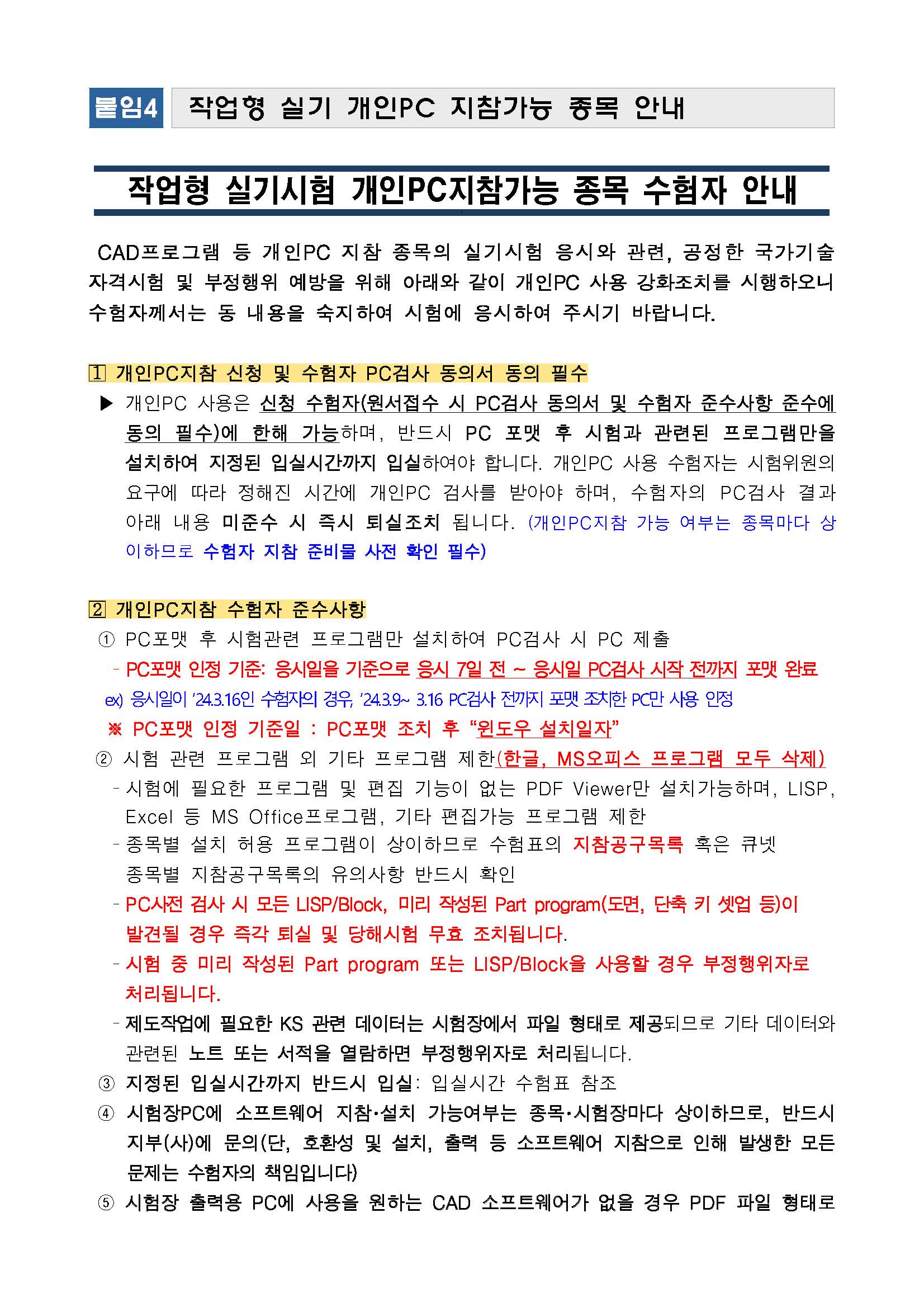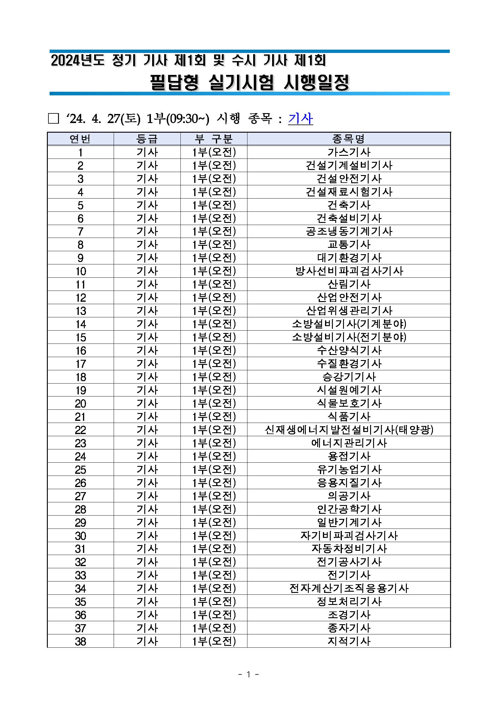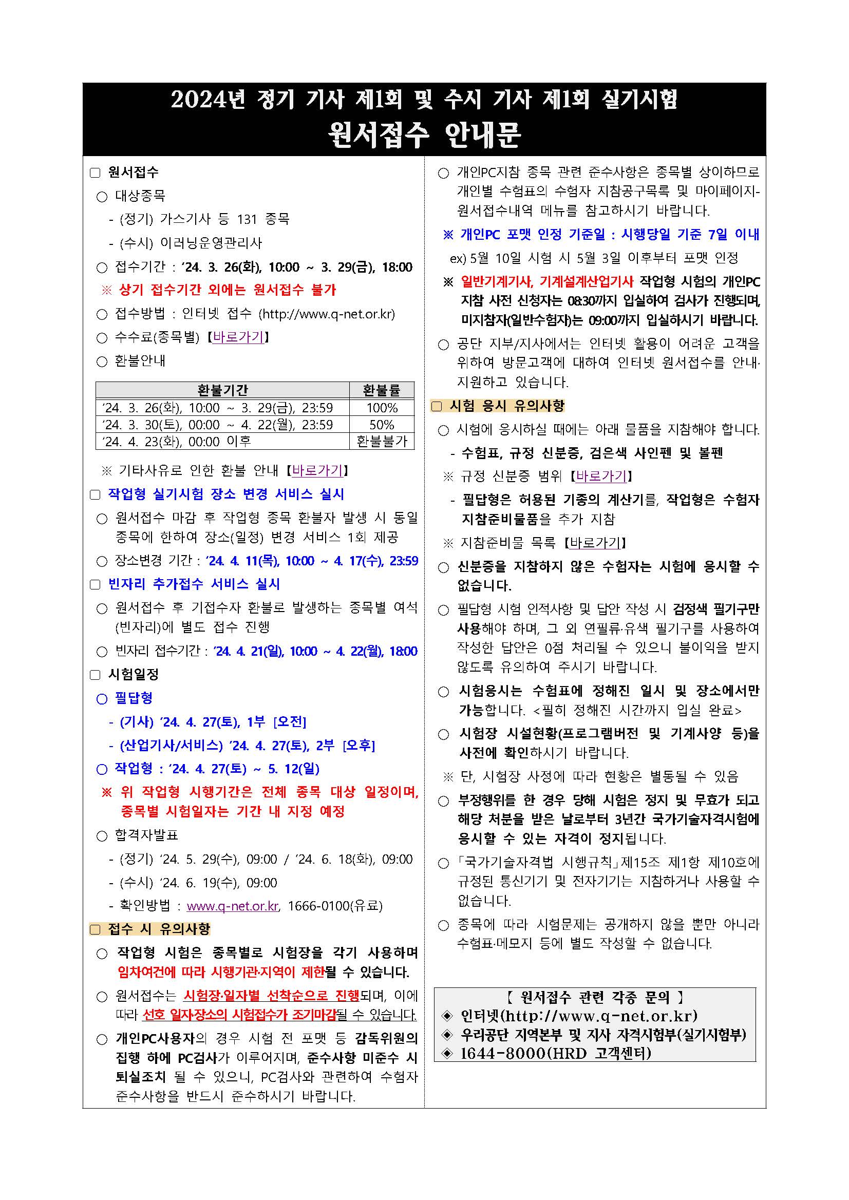 2024년도 정기 기사 제1회 및 수시 기사 제1회 실기시험 원서접수 안내문, 필답형 시험일정 및 시험장, 작업형 시설장비 현황(예정) 을 사전공개하오니 원서접수 시 참고하시기 바랍니다.