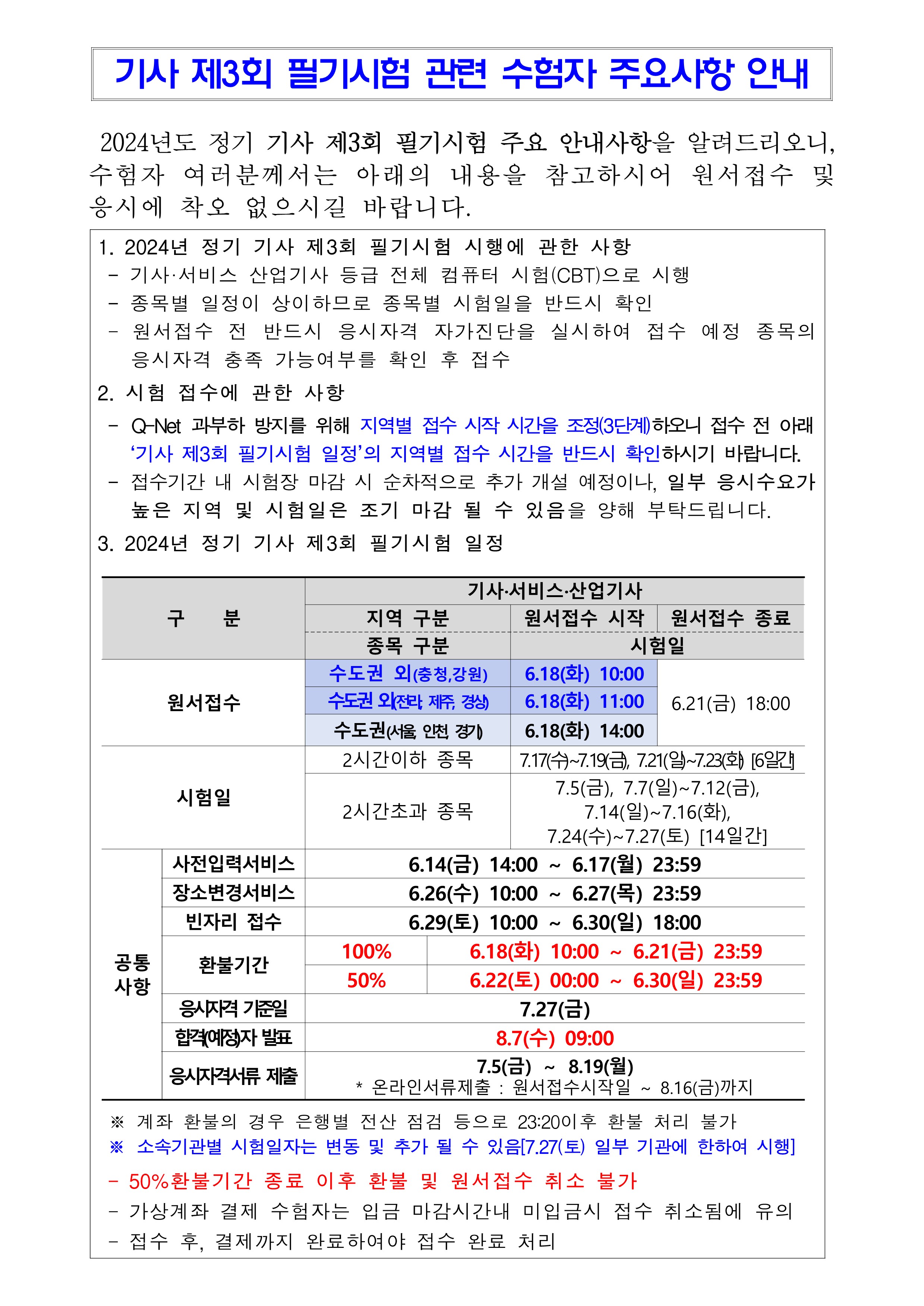 2024년도 기사 제3회 필기시험 원서접수 주요 안내사항