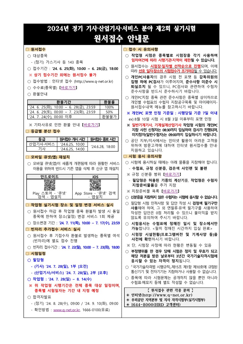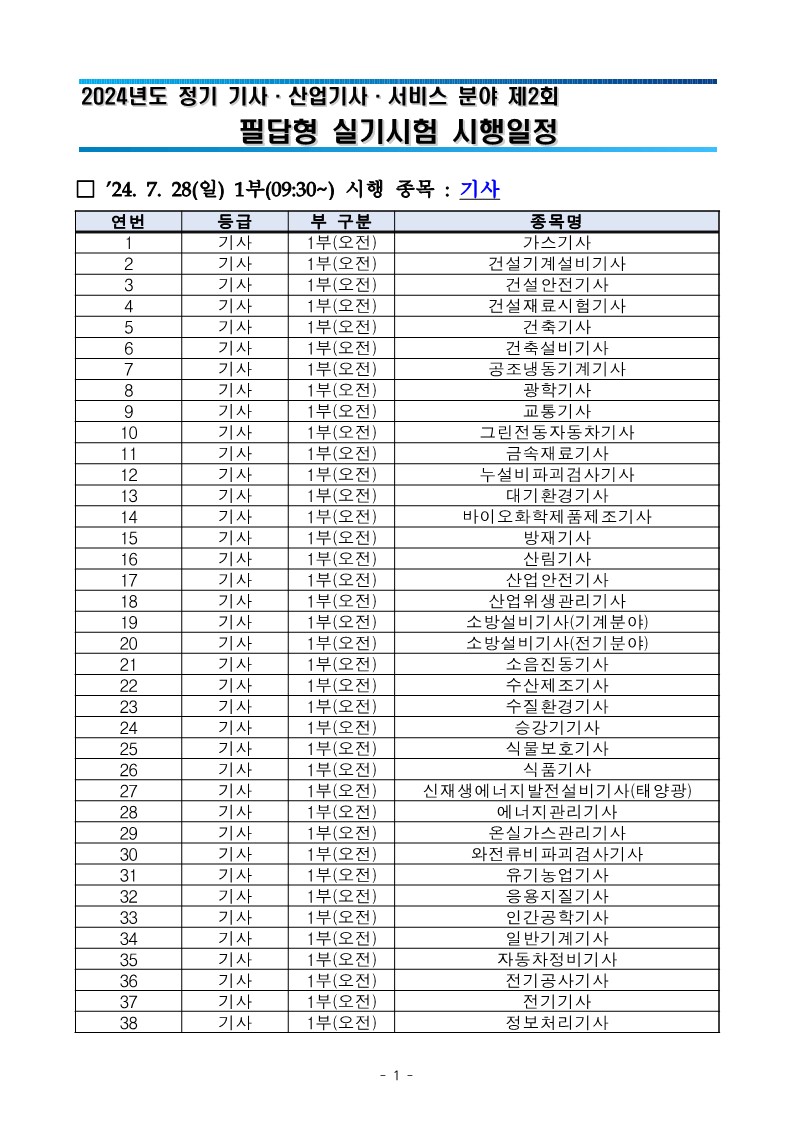 2024년도 기사 제2회 실기시험 원서접수 안내문, 필답형 시험일정 및 시험장, 작업형 시설장비 현황(예정)을 공지하오니 원서접수 시 참고하시기 바랍니다. |