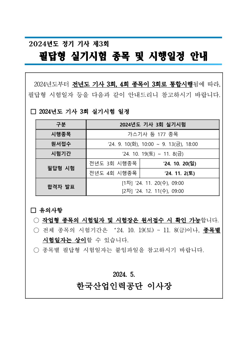 2024년도 기사 제3회 실기시험 원서접수 안내문, 필답형 시험일정 및 시험장, 작업형 시설장비 현황(예정)을 공지하오니 원서접수 시 참고하시기 바랍니다.