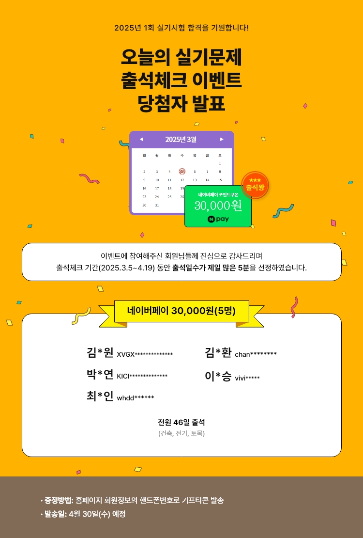 2025년 제1회 오늘의 실기문제 출석체크 이벤트 당첨자 발표