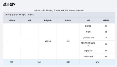 평균79점으로 (응용역학95 측량75 수리70 철콘70 토질85 상하수도80)