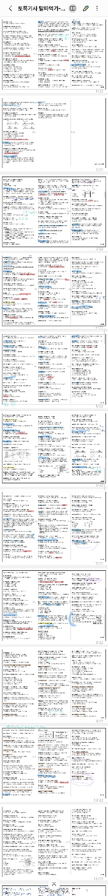 1회독에는 각 유형별로 나눠서 하루에 3회차정도(ex 1일차 - 반중력식 3회, 2일차 - 반중력식 4회, 3일차 - 역t형옹벽 3회 등등) 공부했고 역t형과 슬래브는 하루에 묶어 10일에 걸쳐 공부했습니다. 기분탓인지 모르겠는데 이렇게 공부하니 각 유형별 일반 계산문제에 겹치는 게 많더라고요. 물론 이때까지만 해도 한 회차에서 19개 이상의 문제는 모르는 문제였습니다 ㅎㅎ 2회독에는 각 연도별로 3회차씩 11일동안 문제를 풀었습니다. 분명 잘 공부했다 생각했는데 반중력에서 기울기 고려를 안한채 계산한다거나 역t형 옹벽에서 x1과 x2를 구하지 않은채 계산한다는 등의 어처구니없는 실수를 반복해서 내가 어떤 부분에서 자주 실수하는지에 초점 맞춰 공부했습니다. 이때에는 말따먹기 제외하고 계산문제가 13문제 있다치면 7~8문제는 알고(맞는다 x 어떻게 푸는지는 아는데 확실하게 정답까진 아니고 약간의 보강이 필요한! 근데 문제 유형은 눈에 익은) 나머지는 모르는 단계까지 성장했습니다. 3회독에는 반대로(슬래브, 암거, 부벽, 선반, 역t옹벽, 반중력 순서) 풀되 계산 문제에 집중해서 풀었습니다. 이땐 하루에 2개년씩 풀었습니다. 이땐 물량산출과 공정관리는 무조건 다 맞는다 절~~~대 틀리는 거 없이 눈 감고도 풀 수 있을 정도여야하고 이때 계산문제는 13문제 중 2~3개 빼고는 다 풀줄 알거나 문제가 눈에 익은 상태라 대충 풀이과정을 적을 줄 아는 상태여야 합니다. 눈에 익은 상태를 강조하는 이유는 예를들어 덤프나 도저 등의 작업기계 문제를 풀 때 f가 본바닥 토량인지, 1/L인지. 1/C인지 그냥 C나 L인지 등등 너무 헷갈리지않습니까. 또 뭐는 60이고 뭐는 3600이고 뭐는 AL이고 뭐는 q ρ고 뭐는 qk고 등등 이런점을 헷갈리긴해도 구분할줄 알아야하는 정도여야 합니다. 어렵다 싶으면 작업기계 문제를 남은 한달정도의 기간동안 계속 반복하여 학습하세요 정말 도움이 많이 됐습니다.