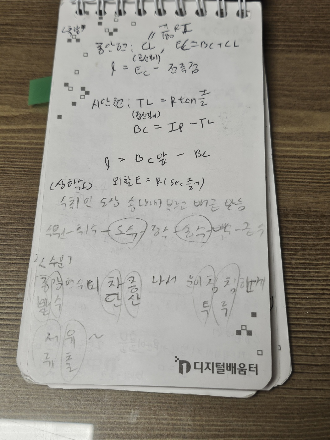 <측량학> 계산보단 글로 적힌 문제가 많아 공부가 어렵진 않았던 것 같습니다. 아직도 기억나는 문장으로는 "완화 곡선의 접선은 시점에서 직선에, 종점에서 원호에 접한다." 입니다. 자꾸 직선과 원호를 바꾸시더라고요 높은 확률로 틀린 문장은 이 문장이 정답이었습니다. 점조건 변조건 각조건로 알고계시길 바랍니다.