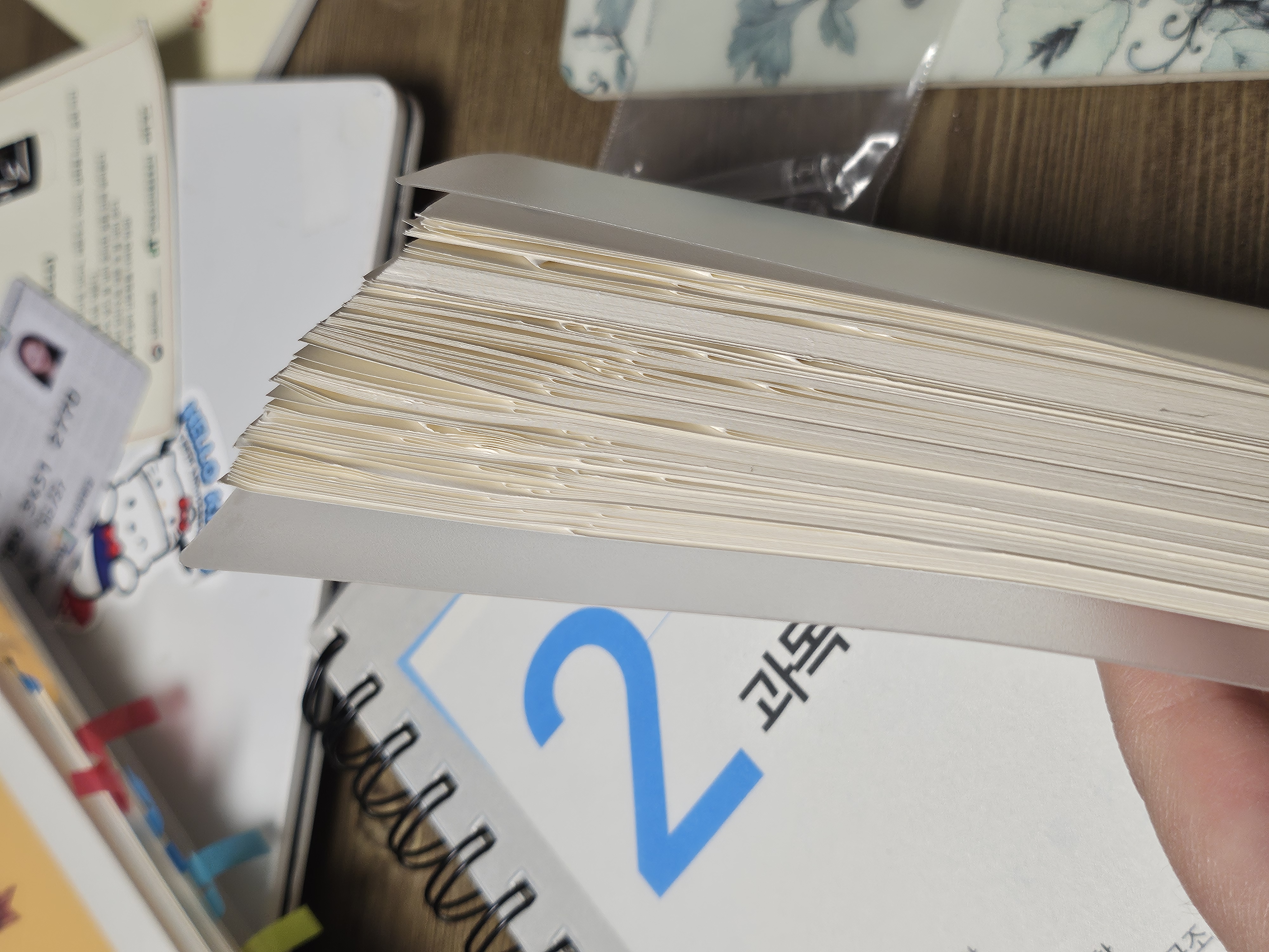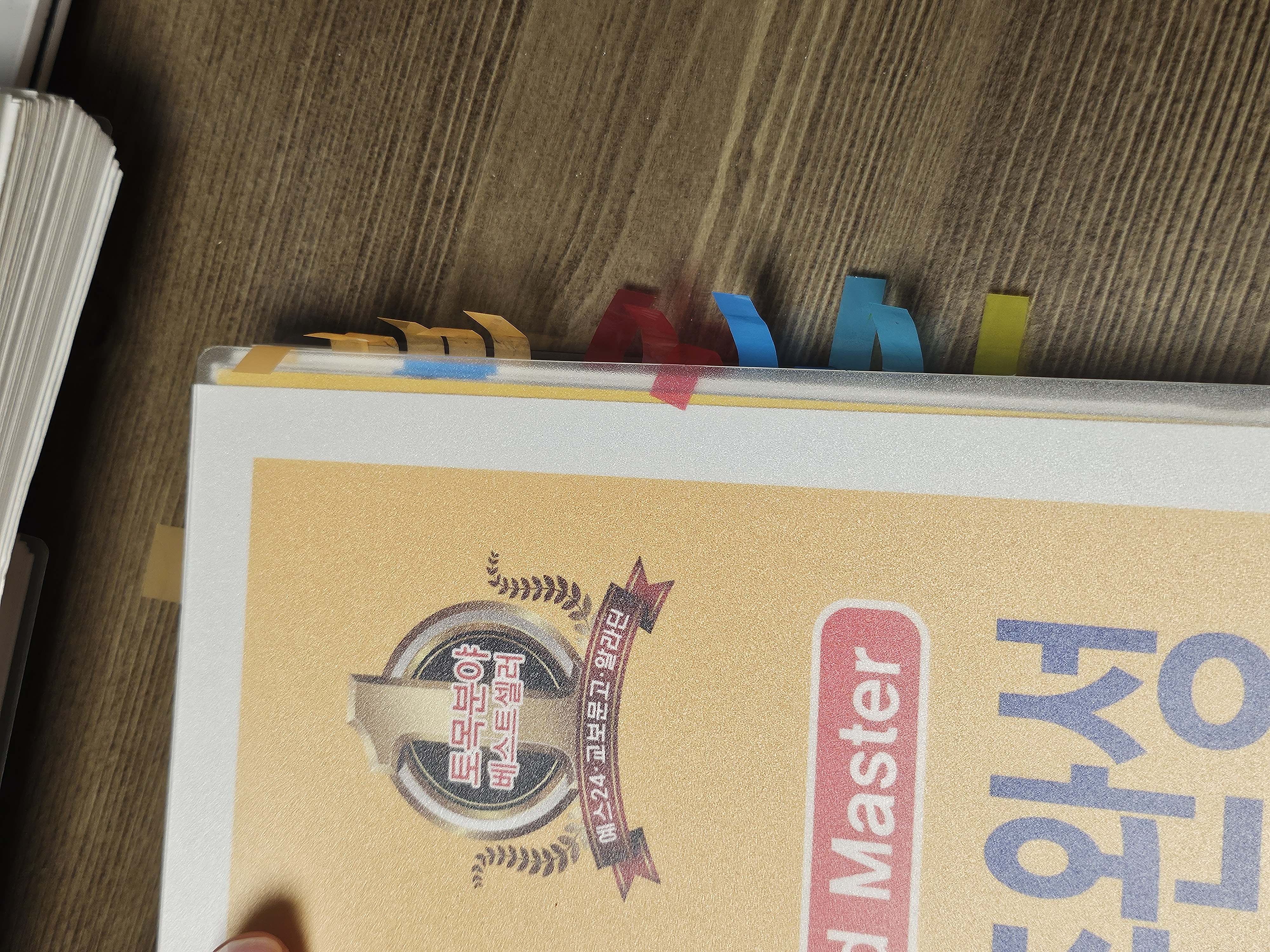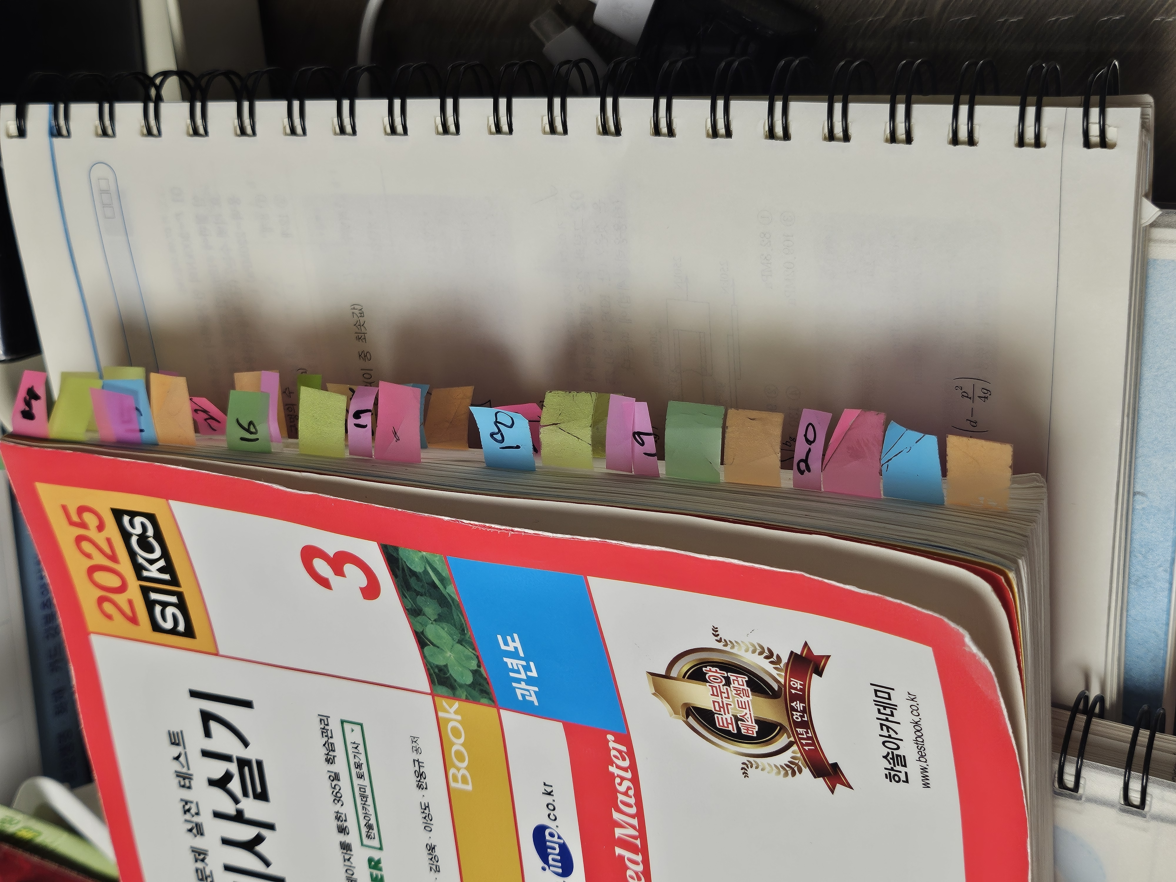 1단계는 가볍게 풀며 숙지보단 까먹고 있던 개념 정리를 목표로 공부해나갔습니다. 각 과목을 풀며 이해되지 않는 개념이나 중요하다 생각되는 개념엔 인덱스를 붙여 재확인이 용이하게 표시했고, 각 과목별 인덱스 색을 다르게 표시해 구분했습니다.