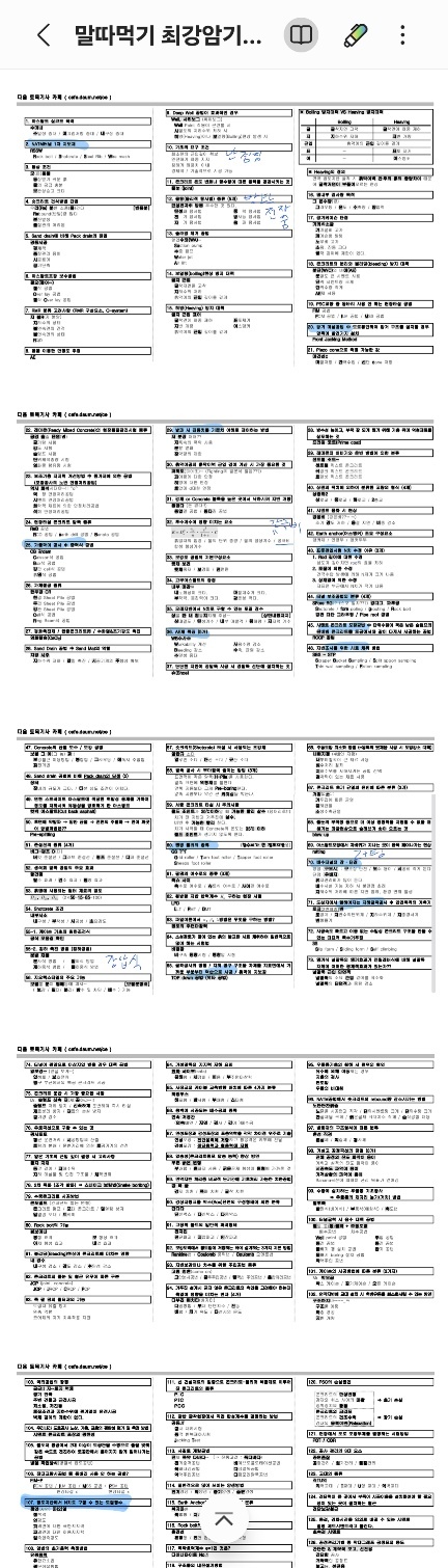 저는 말따먹기 파일 4개를 돌려보며 공부했는데 처음엔 파일 모두에 파란 형광펜으로 가득했습니다. 하지만 공부를 거듭하며 암기 된 건 지우는 식으로 공부했고 시험 전날즈음엔 300개중 30개 정도로 줄일 수 있었습니다.