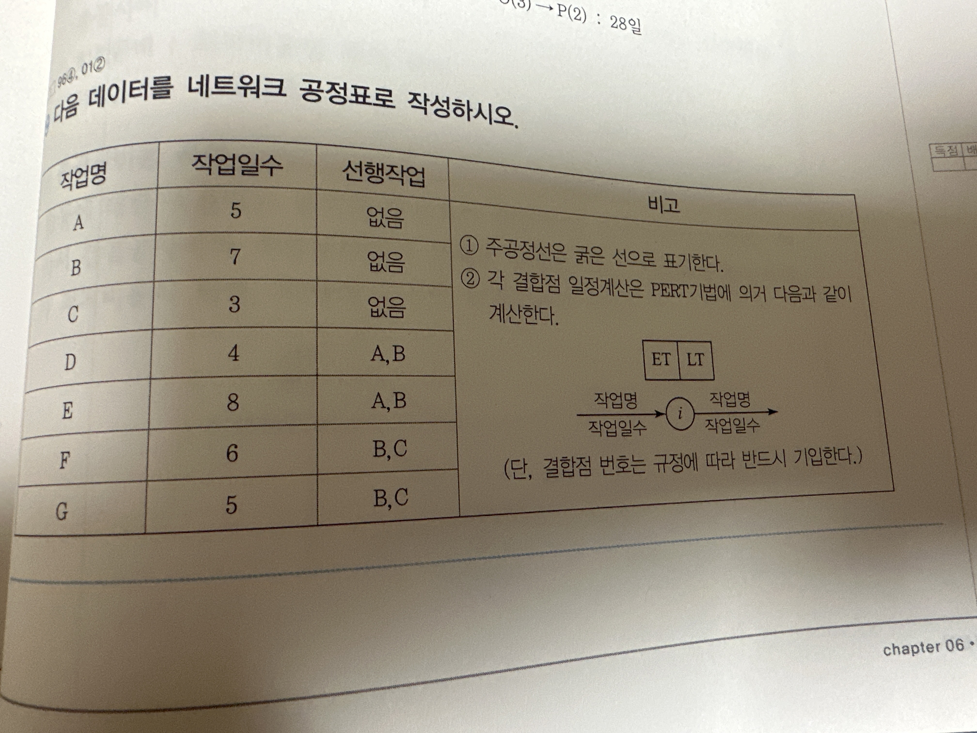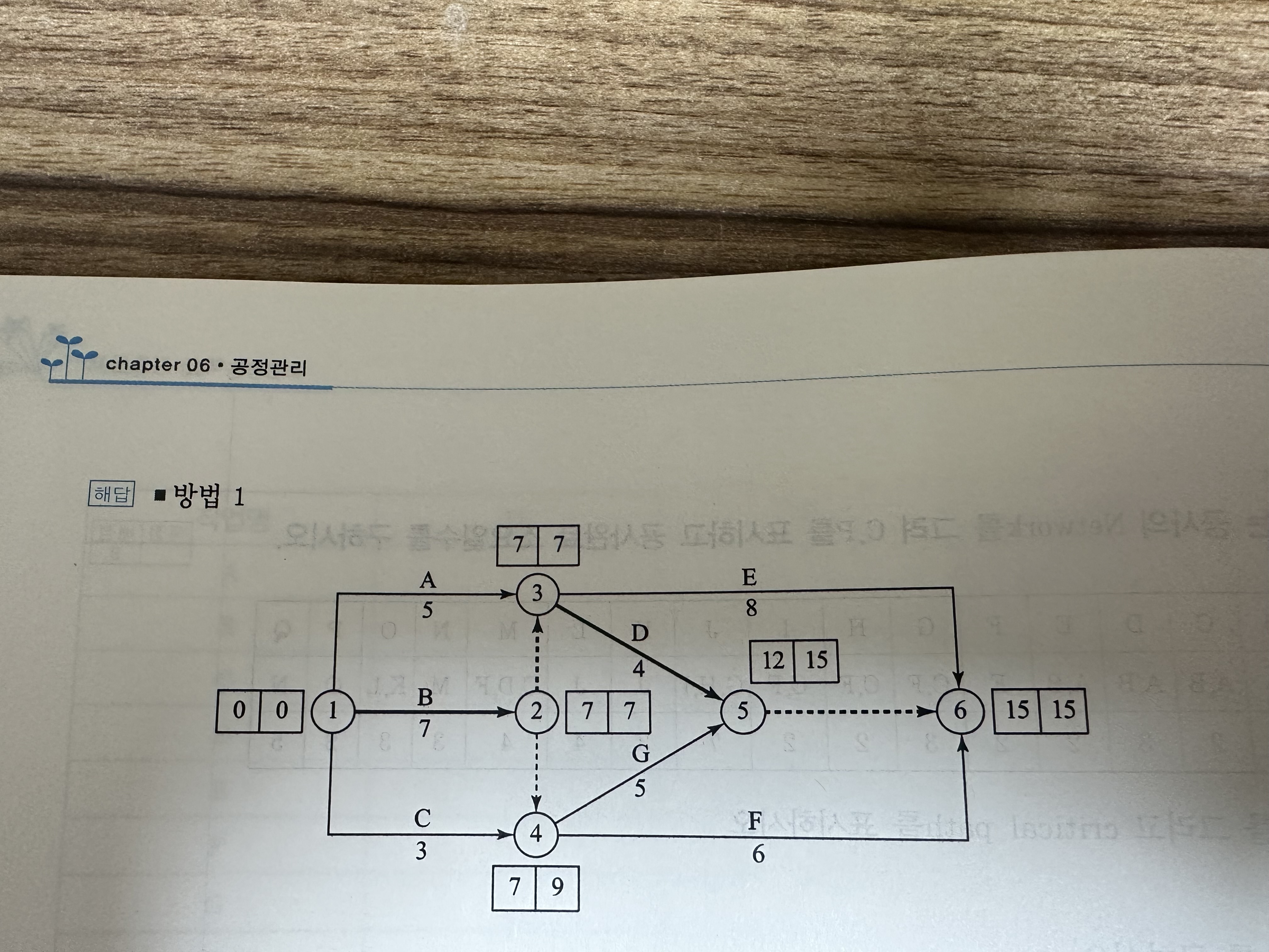 공정표는 작성하는 수험생에 따라 여러가지 답안이 존재할 수 있으며 DE, FG와 같이 작업의 중복을 피하기 위한 넘버링 더미를 만드는 경우에 더욱 그러합니다. 이로 인해 일정계산값은 달라질 수 있지만 CP, 여유시간, 공기단축 등은 교재의 해설과 달라지면 오답이 된다는 점만 유의하시기 바랍니다.
