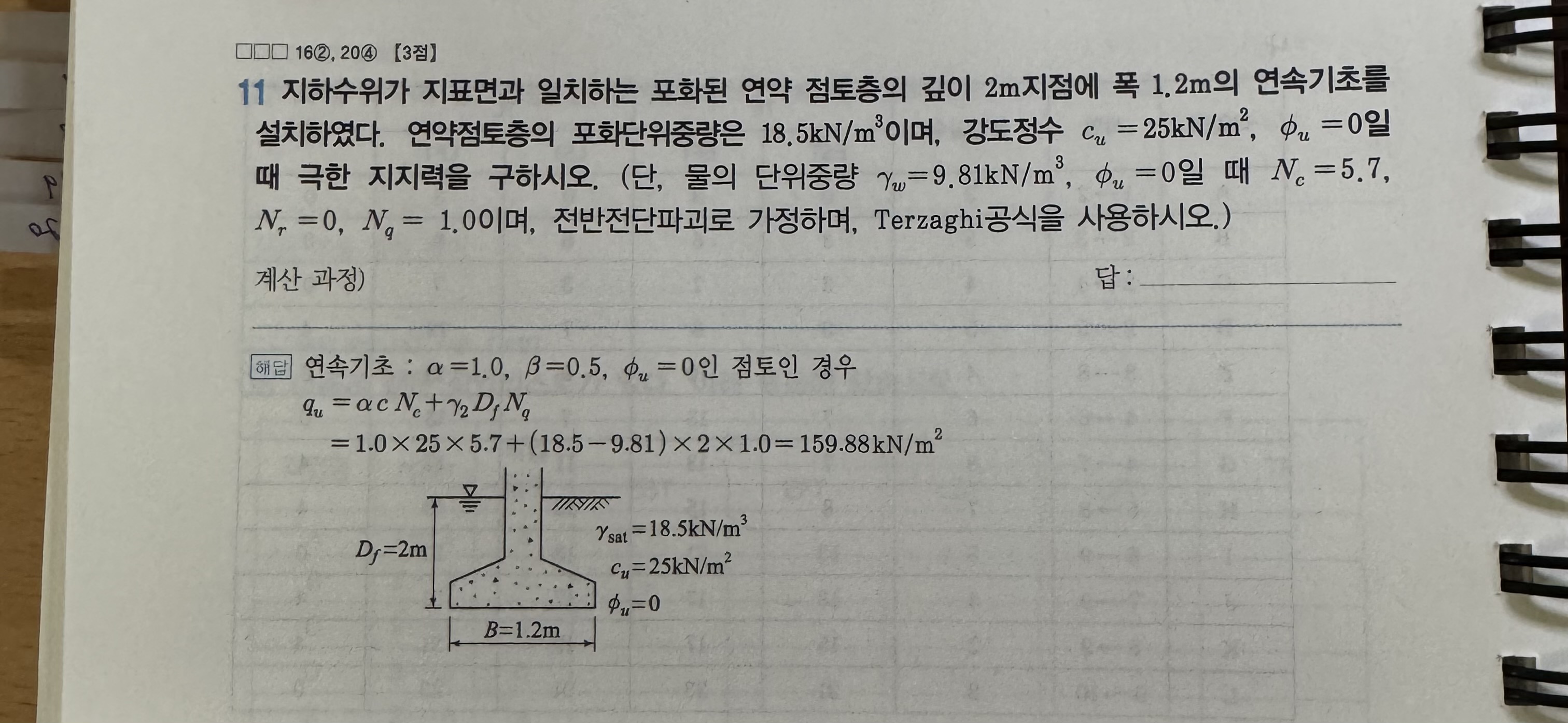 해당문제의 지하수위는 지표면과 일치하므로 극한 지지력 공식에 적용되는 단위중량은 모두 수중단위 중량이 적용됩니다.
