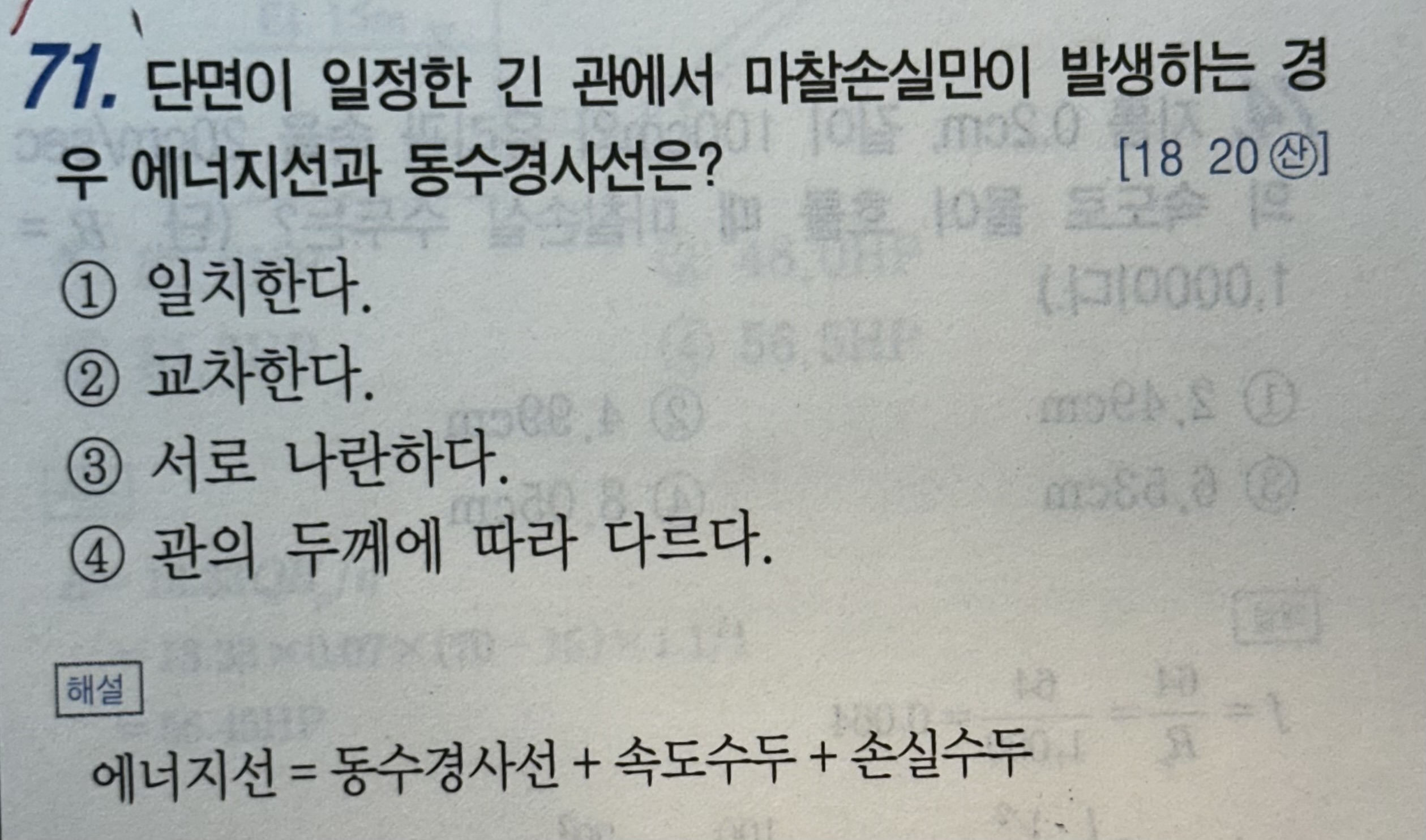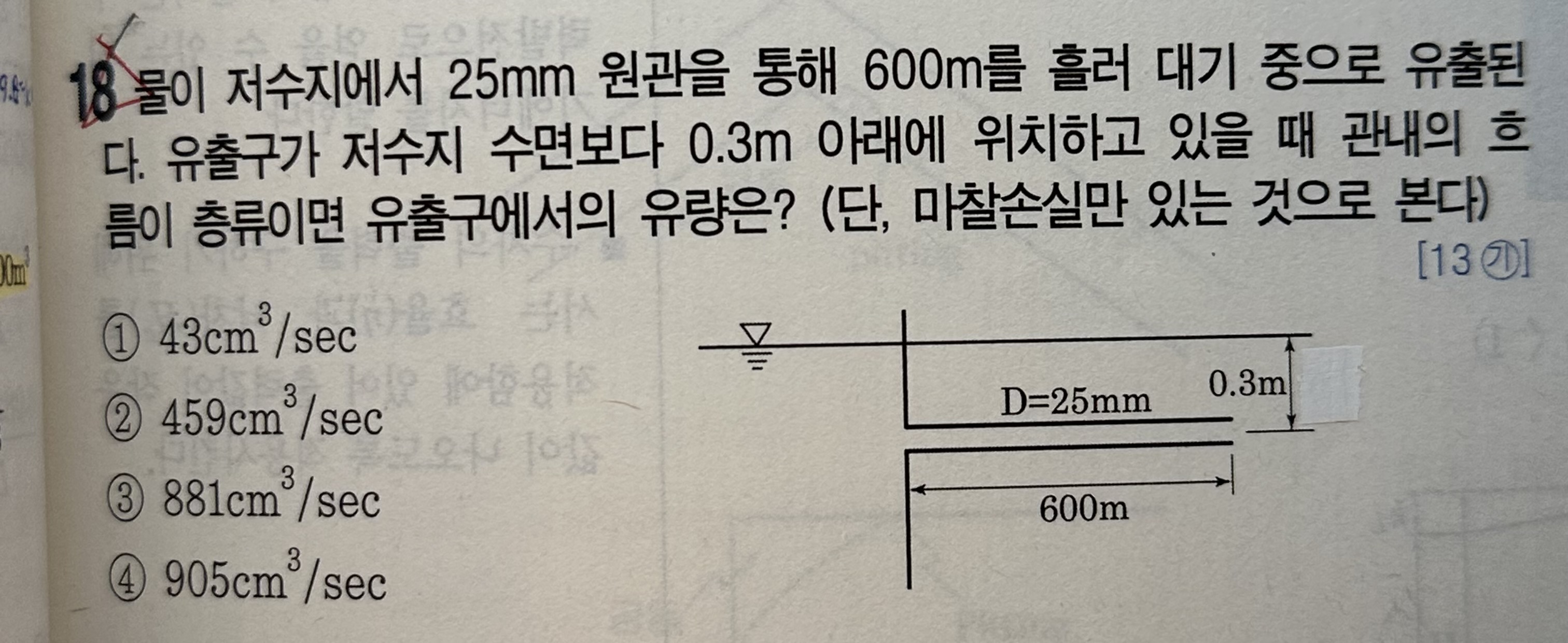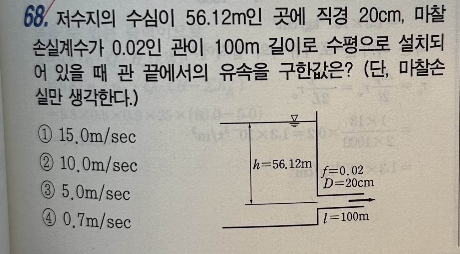 3. 18번문제는 마찰손실수두공식으로부터 유속을 산출하고 유량을 계산하는 문제이며 68번 문제는 마찰손실수두를 산출하고 수면과 관끝을 베르누이방정식(손실을 포함한 실제식)을 통해 유속을 구하는 문제로 다른 문제입니다.