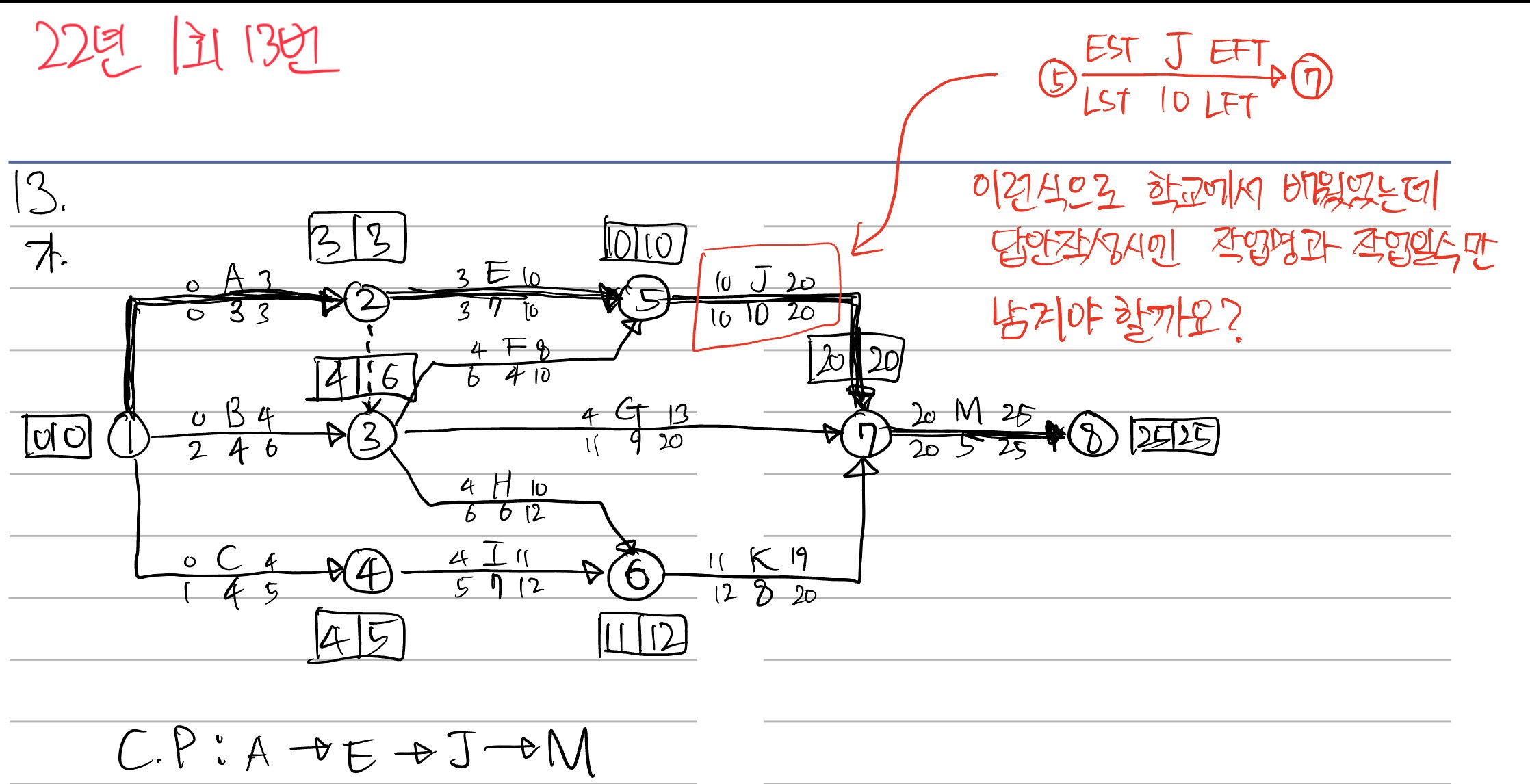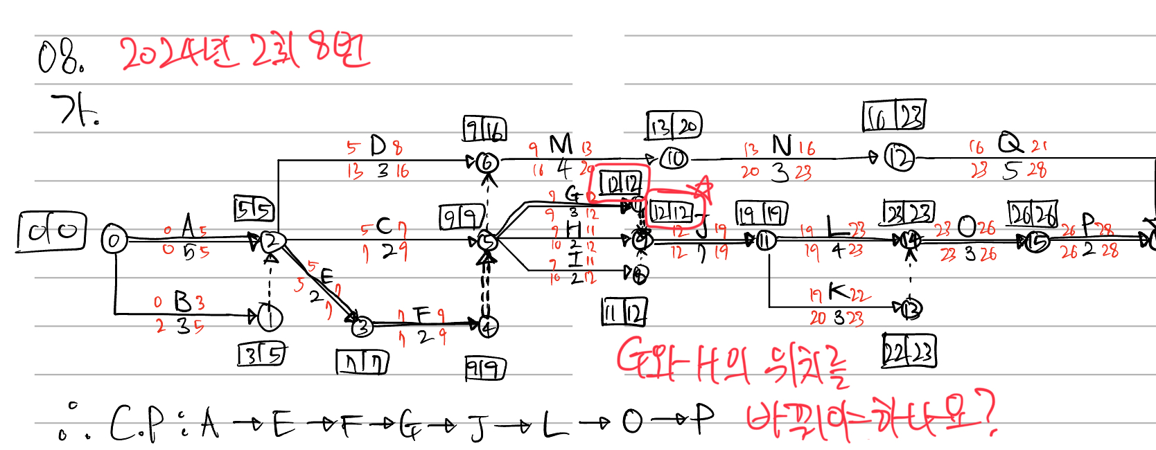 3. 더미의 위치가 바뀌면서 일정값이 달라질 수 있습니다. 다만 이를 활용한 여유시간, 공기단축, 최적공기의 결과는 교재의 해설과 달라지면 오답이 된다는 점만 유의하시기 바랍니다.