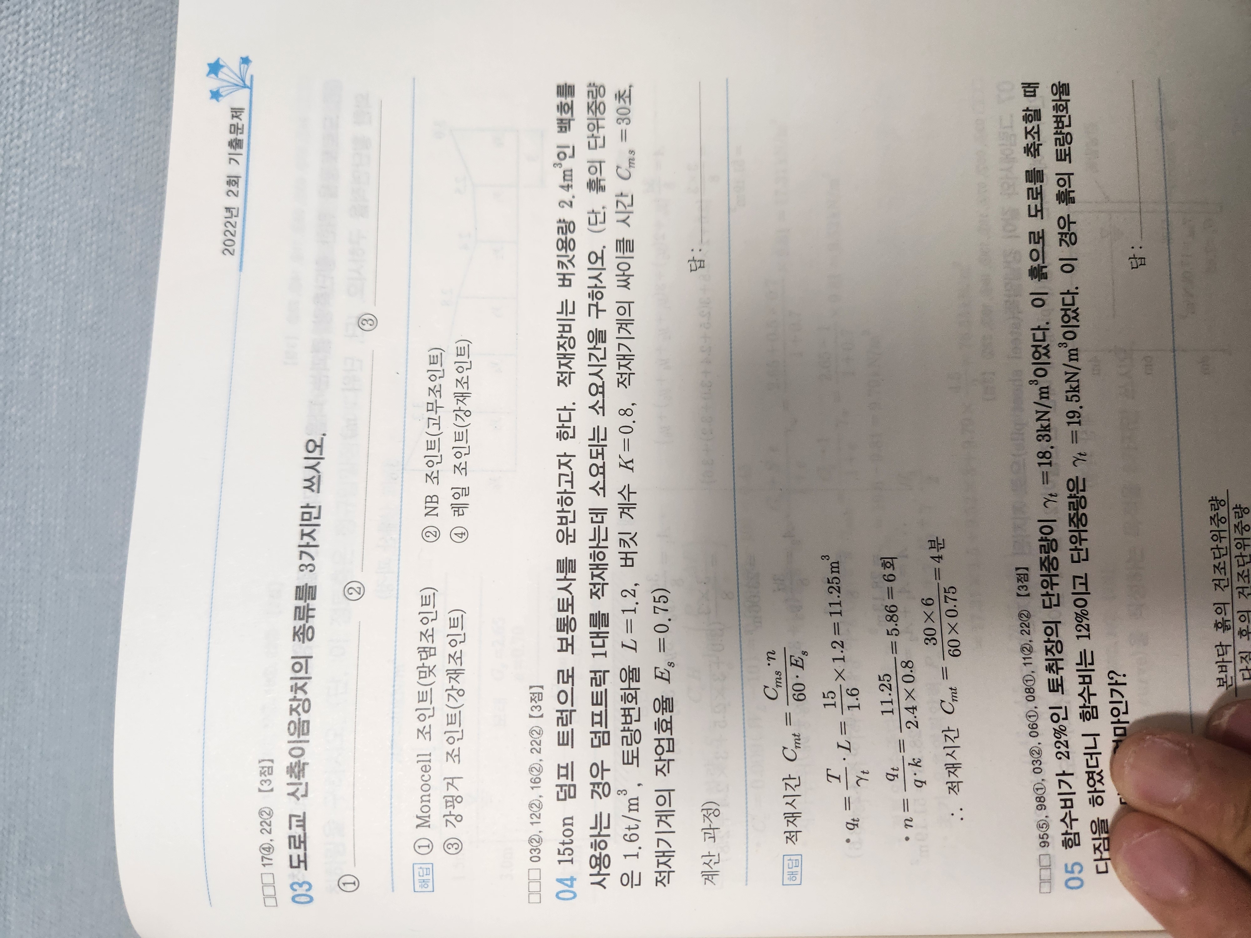 추가적으로 덤프트럭의 사이클 타임 산정시 적재시간을 산정하여 작업량을 계산하는 문제 또한 출제가 되므로 해설의 내용으로 답안을 산출하시는게 여러모로 좋습니다.