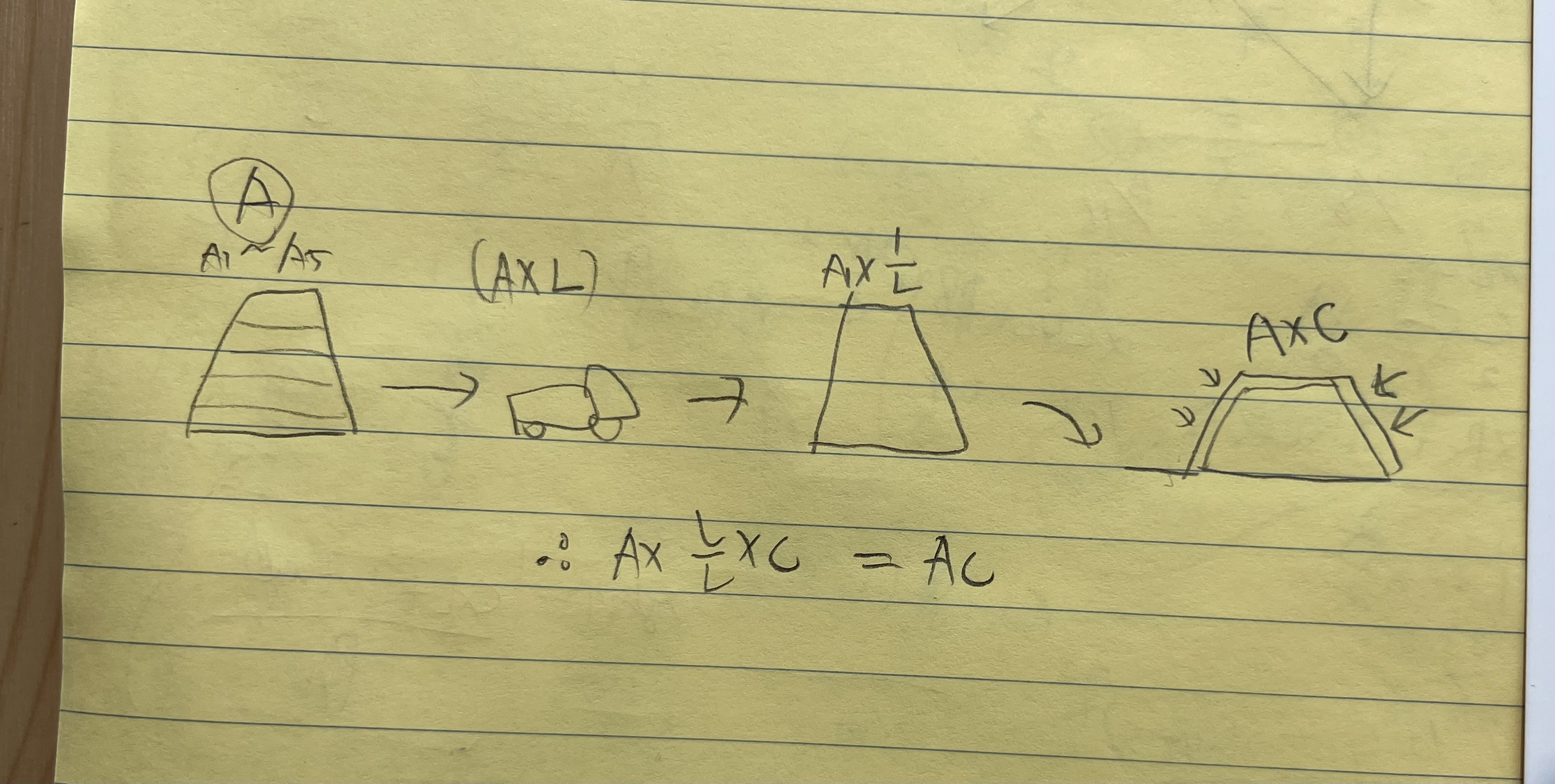 1. 첨부하신 그림처럼 이해하셔도 되지만, 간단히 등고선을 이용하여 계산한 체적은 자연상태이므로 다짐상태(도로)로 환산하기 위해 그냥 C를 곱하면 됩니다.