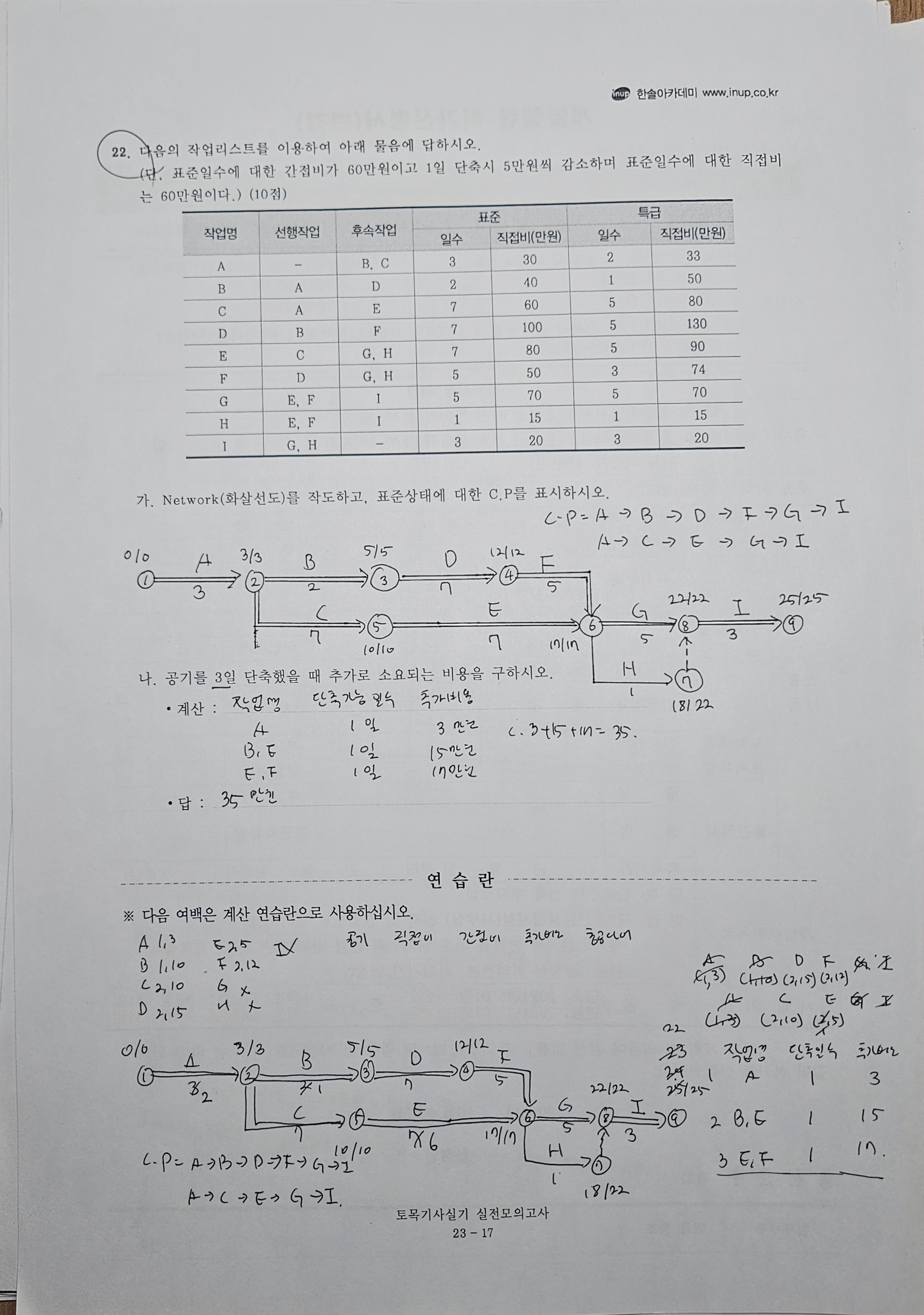 [온라인강의] 2025년 토목기사 실기 모의고사 1회차 공정관리 문제 문의드립니다.