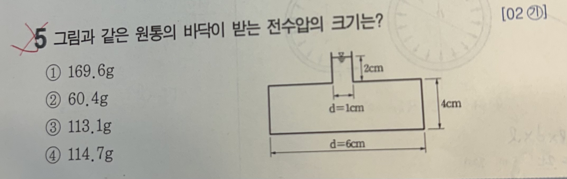 직경 1cm에 대한 전수압과 직경 6cm에 대한 전수압을 각각 구해서 더해주면 정답은 4번이 됩니다.