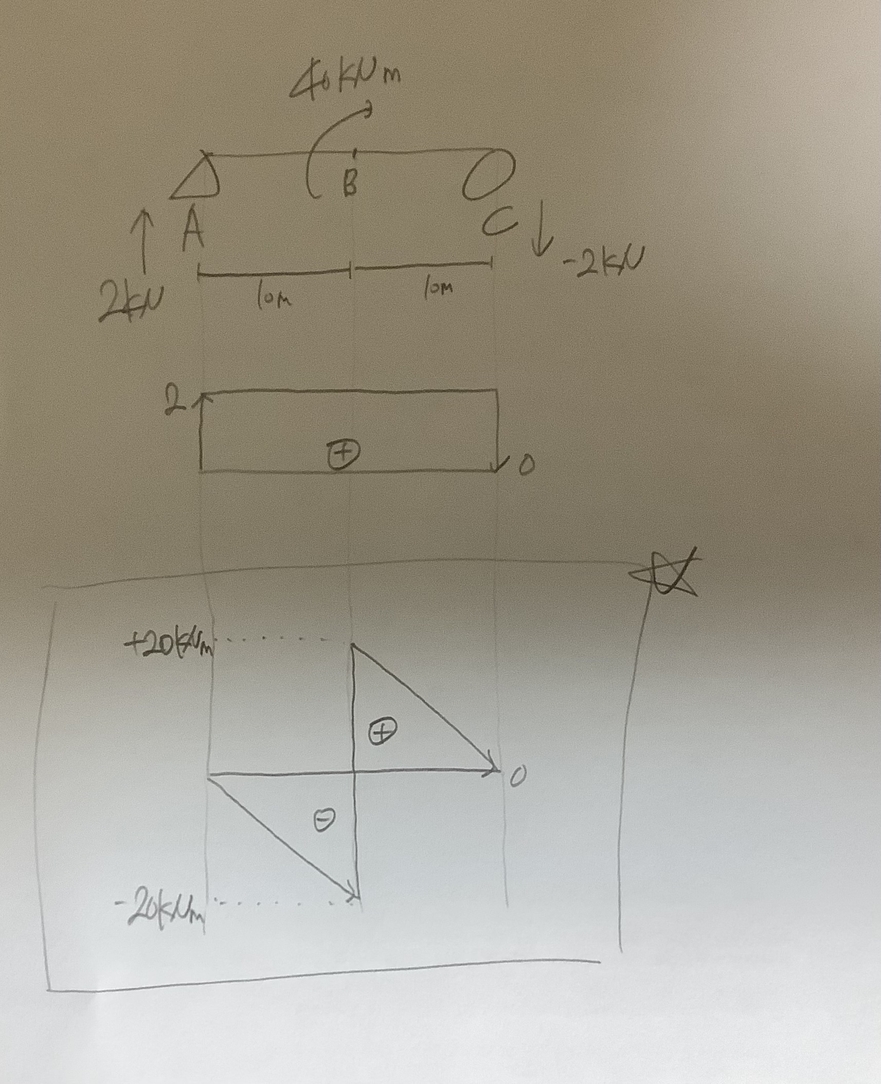 그림에서와 같이 Va=2kN(↑), Vc=-2kN(↓) 가 작용하고 B점에서 40kNm의 모멘트가 작용할 때 휨모멘트도가 위의 그림과 같이 삼각형 형태로 그려진다고 합니다.