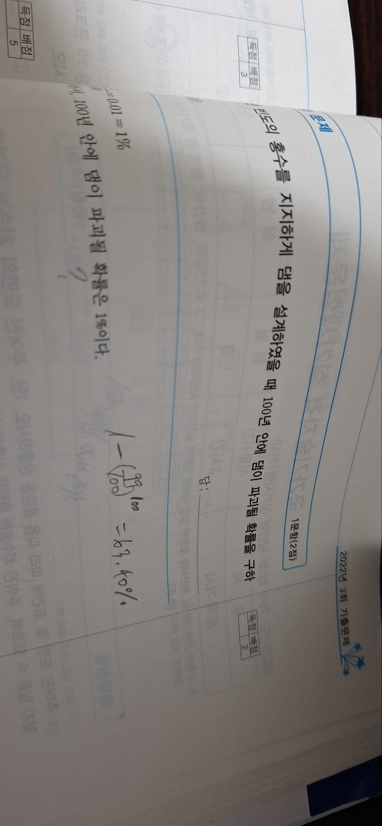 100년 안에 파괴 확률은 1-100년동안 한번도 댐이 파괴되지 않을 확률(0.99^100) 해야하는 것 아닌지요?