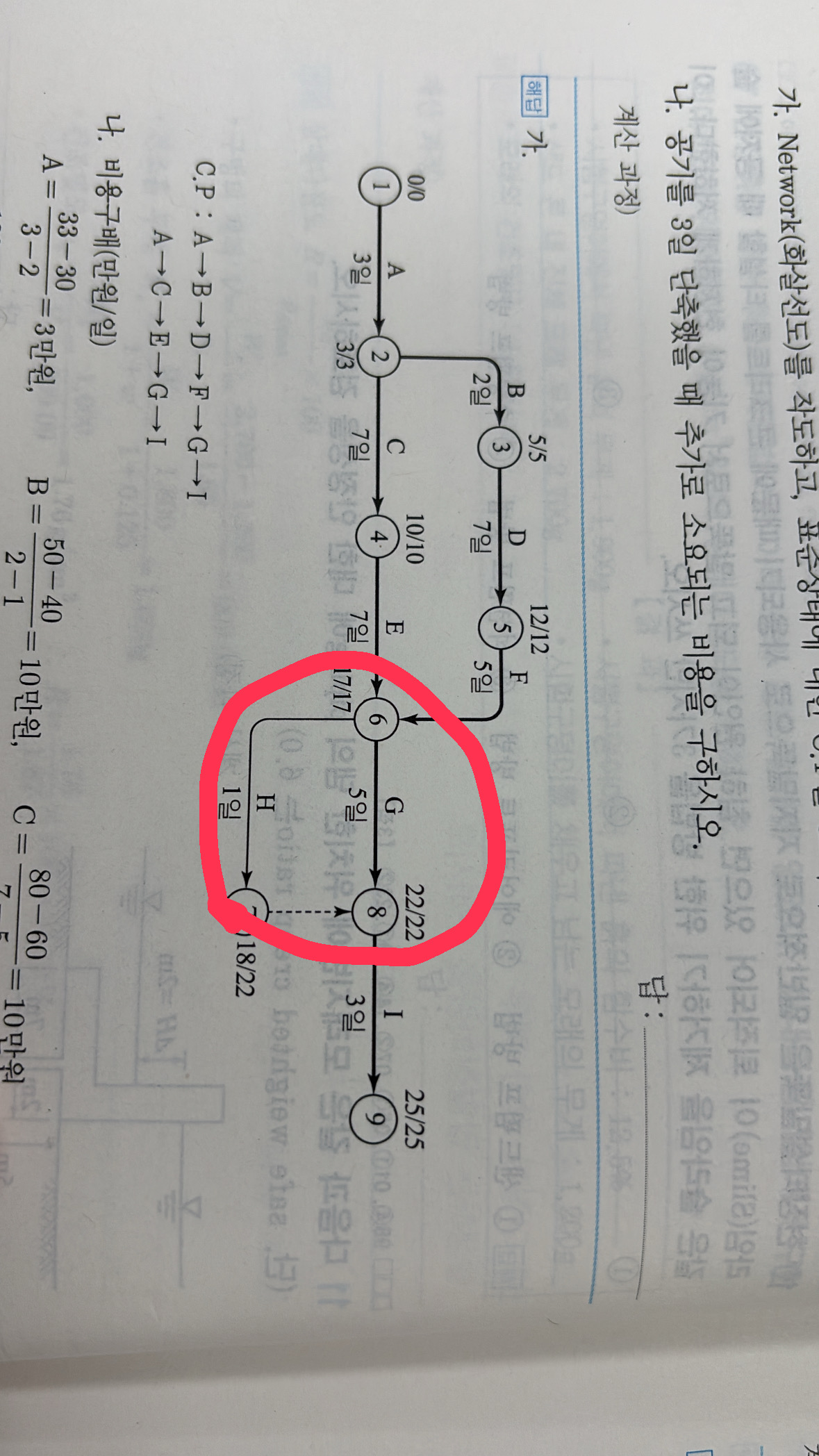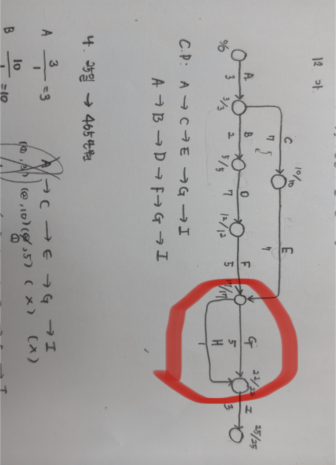 G, H작업 중 하나의 작업에는 작업의 중복을 피하는 넘버링 더미를 만들지 않으면 공정표 작성의 오류로 오답처리됩니다.