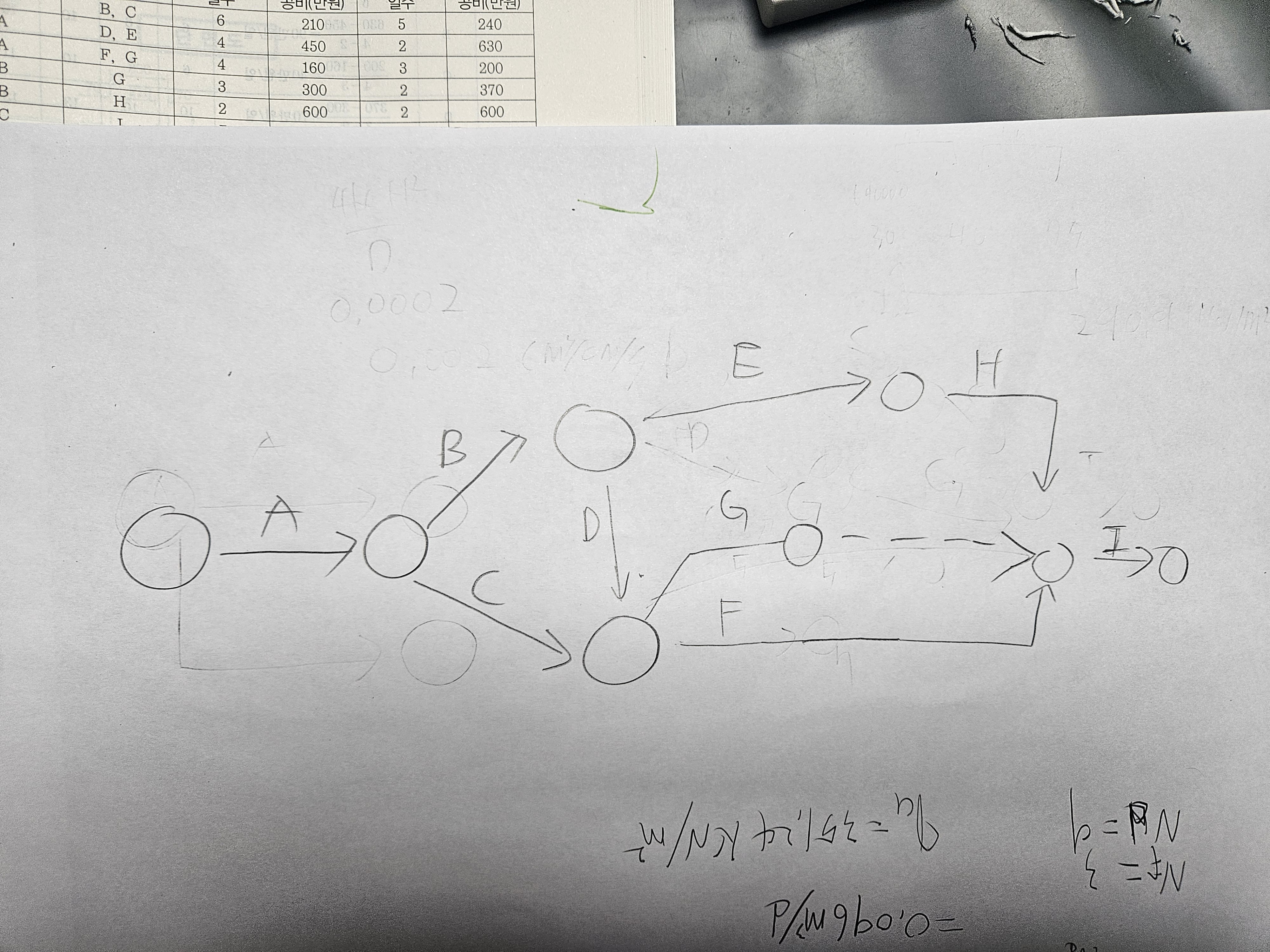 F작업의 선행작업은 C작업이어야 하는데 작성하신 공정표는 CD작업으로 되어 있으며 G작업 뒤에 더미는 불필요한 더미입니다.