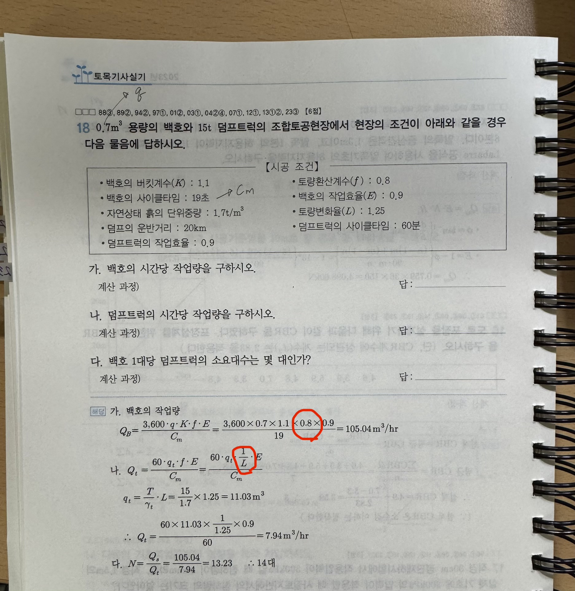 추가적으로 백호의 1회 작업량을 q x k로 적용하기 때문에 1회 작업량은 느슨한 상태로 산출됩니다. 이에 토량환산계수f는 1/L=1/1.25=0.8을 적용하게 된 것입니다.