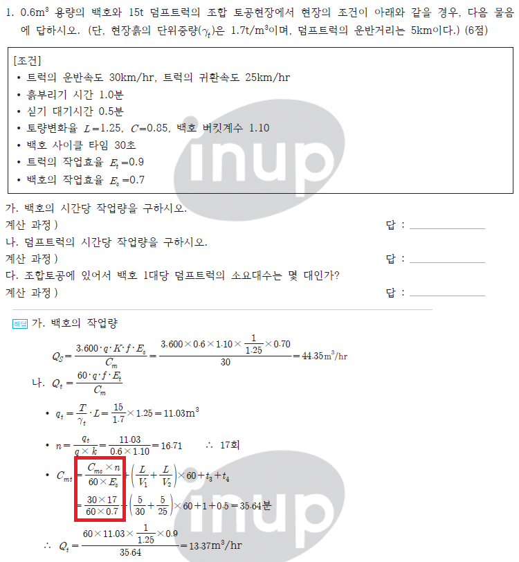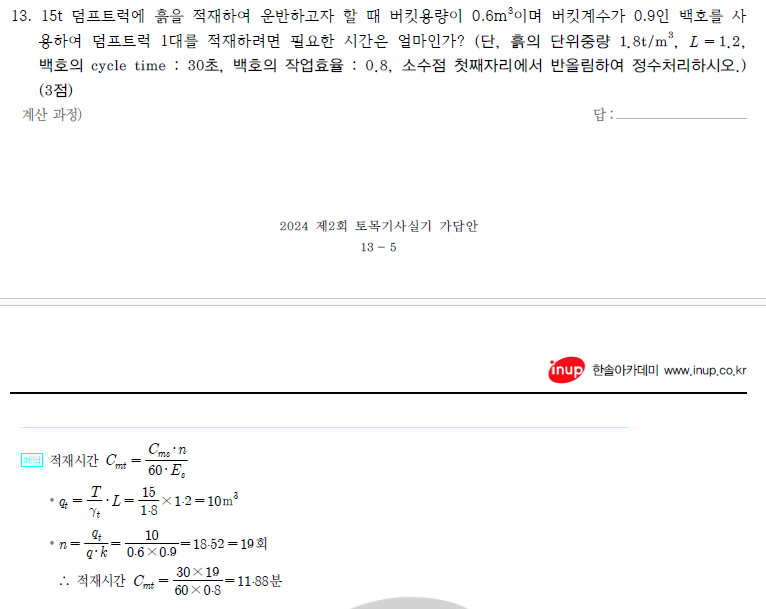 참고로 건설기계강의 트럭파트에서 작업량 산정시에 고려해야하는 내용(qt, ,n, 적재시간 등)에 대해서 자세히 설명드렸었습니다. 시간이 되시면 교재 또는 강의를 통해 정리하시는 것을 추천드립니다.