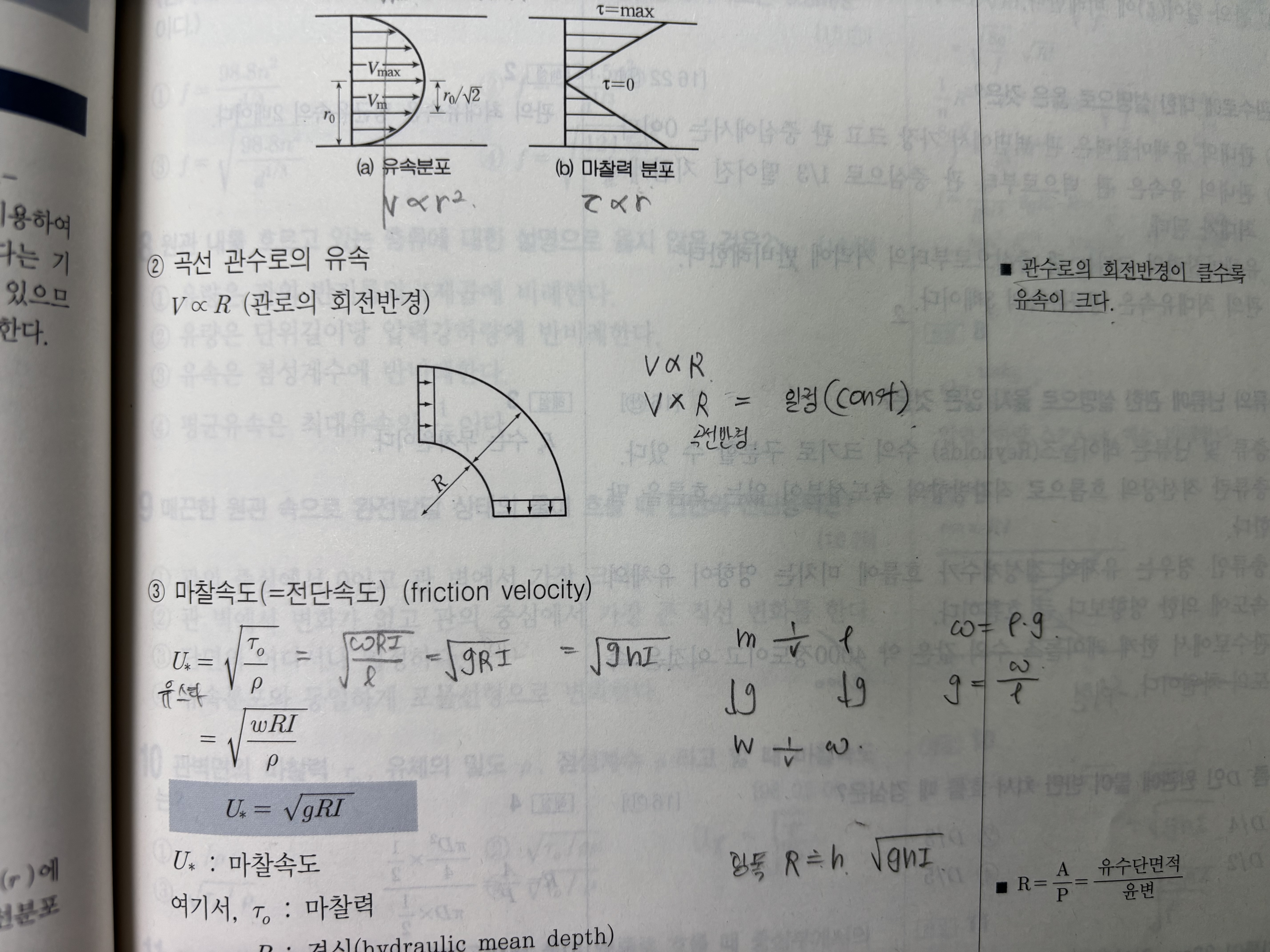 다만 관수로 개수로 모두 유속과 회전반경의 곱은 일정하다 답변을 주셔서 교재 내용의 차이를 보여드리기 위해 첨부했습니다.