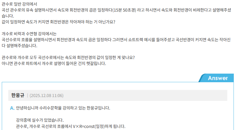 이때 관수로 개수로 모두 속력과 회전반경의 곱은 일정하다라는 답변을 주셨는데