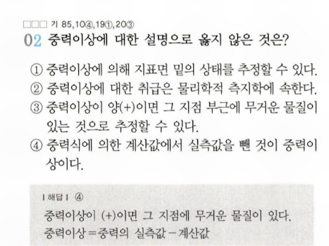 교재 1-57 페이지의 핵심문제 2번의 해설에서는 중력이상 = 중력의 실측값 - 계산값 이라고 나와있습니다