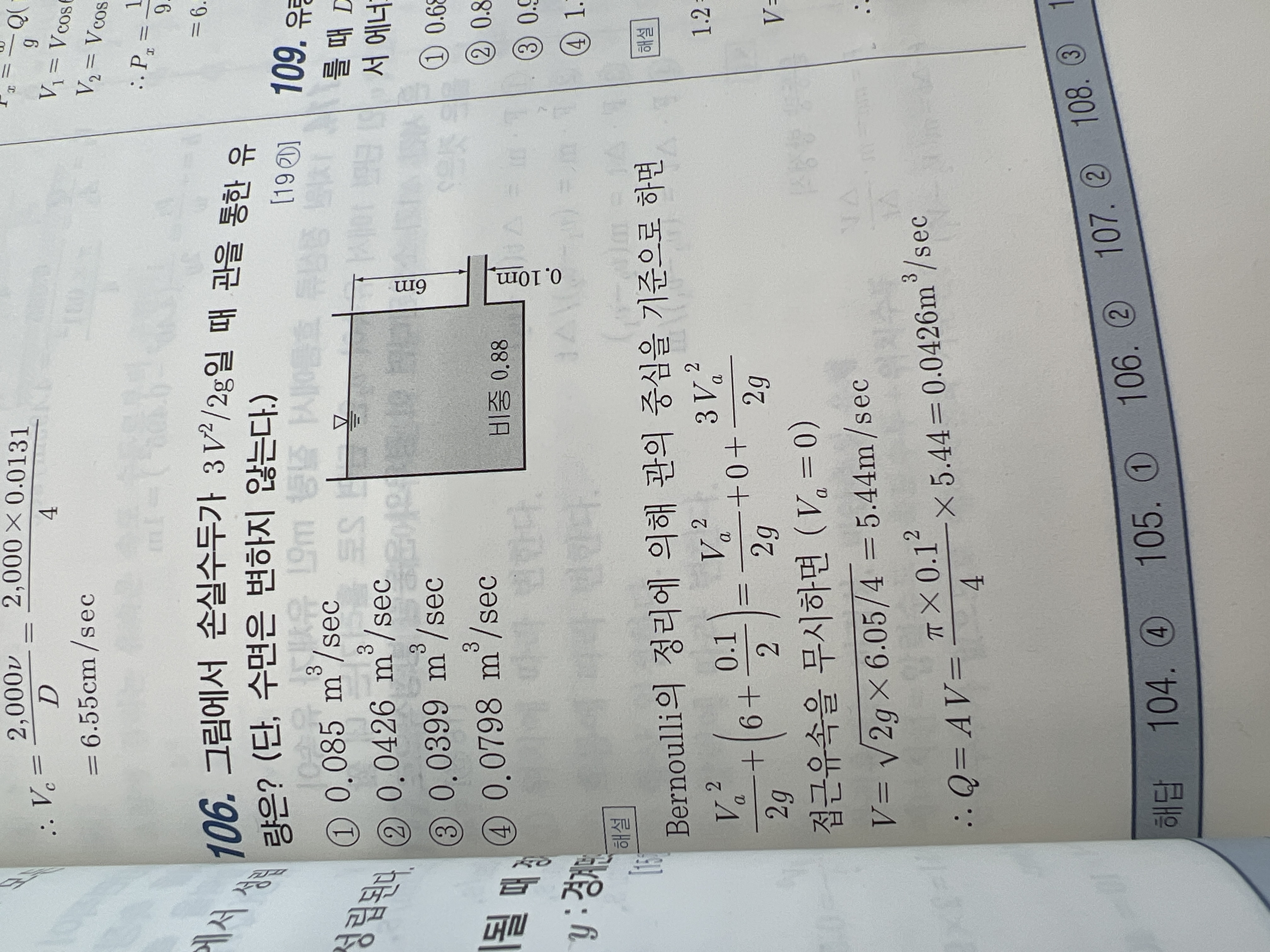 관의 중심을 기준으로 하여 베르누이방정식을 적용하면 수면과 관끝은 대기압을 받게 되므로 압력수두를 0으로 보고 해석하게 됩니다.