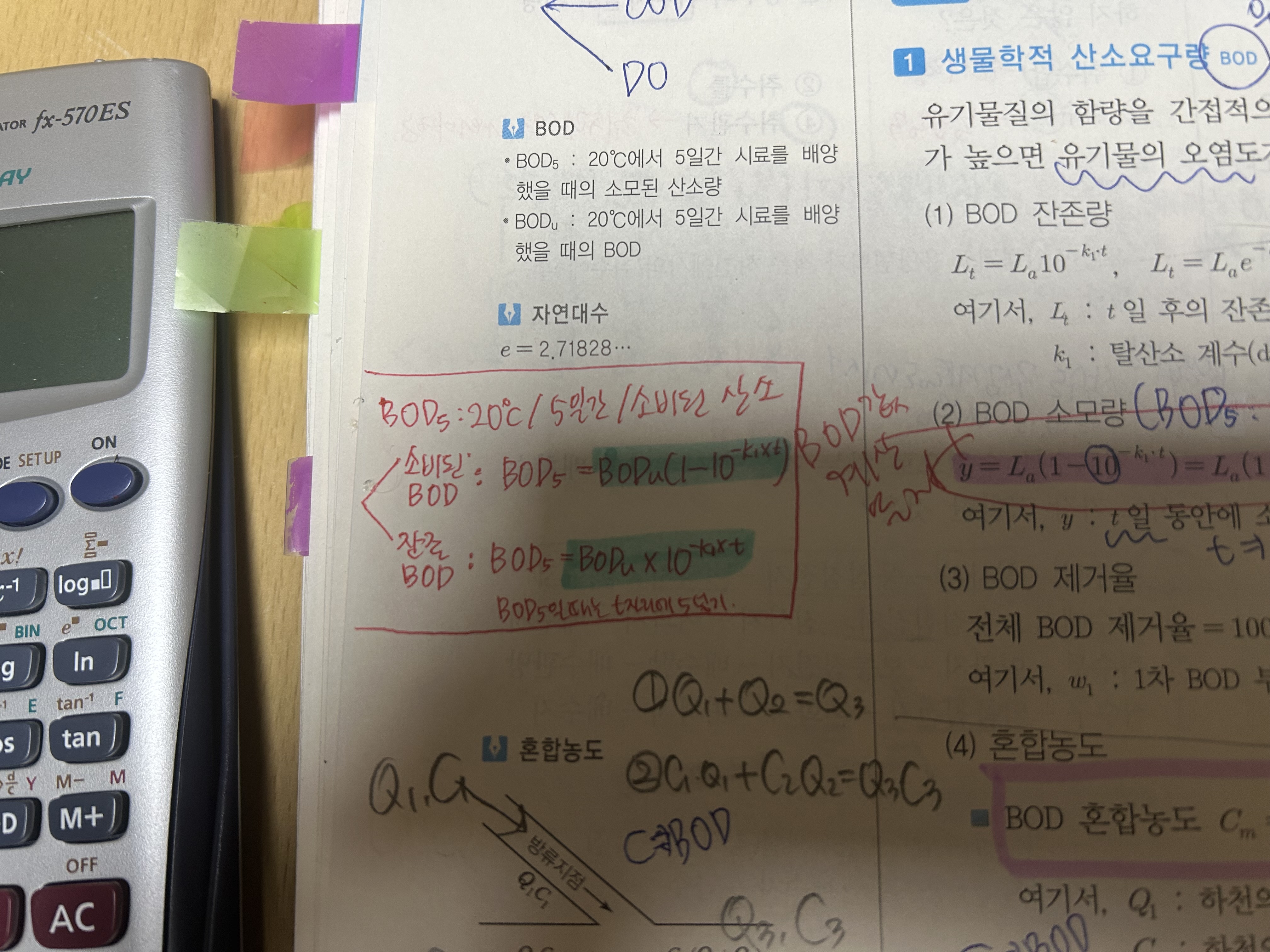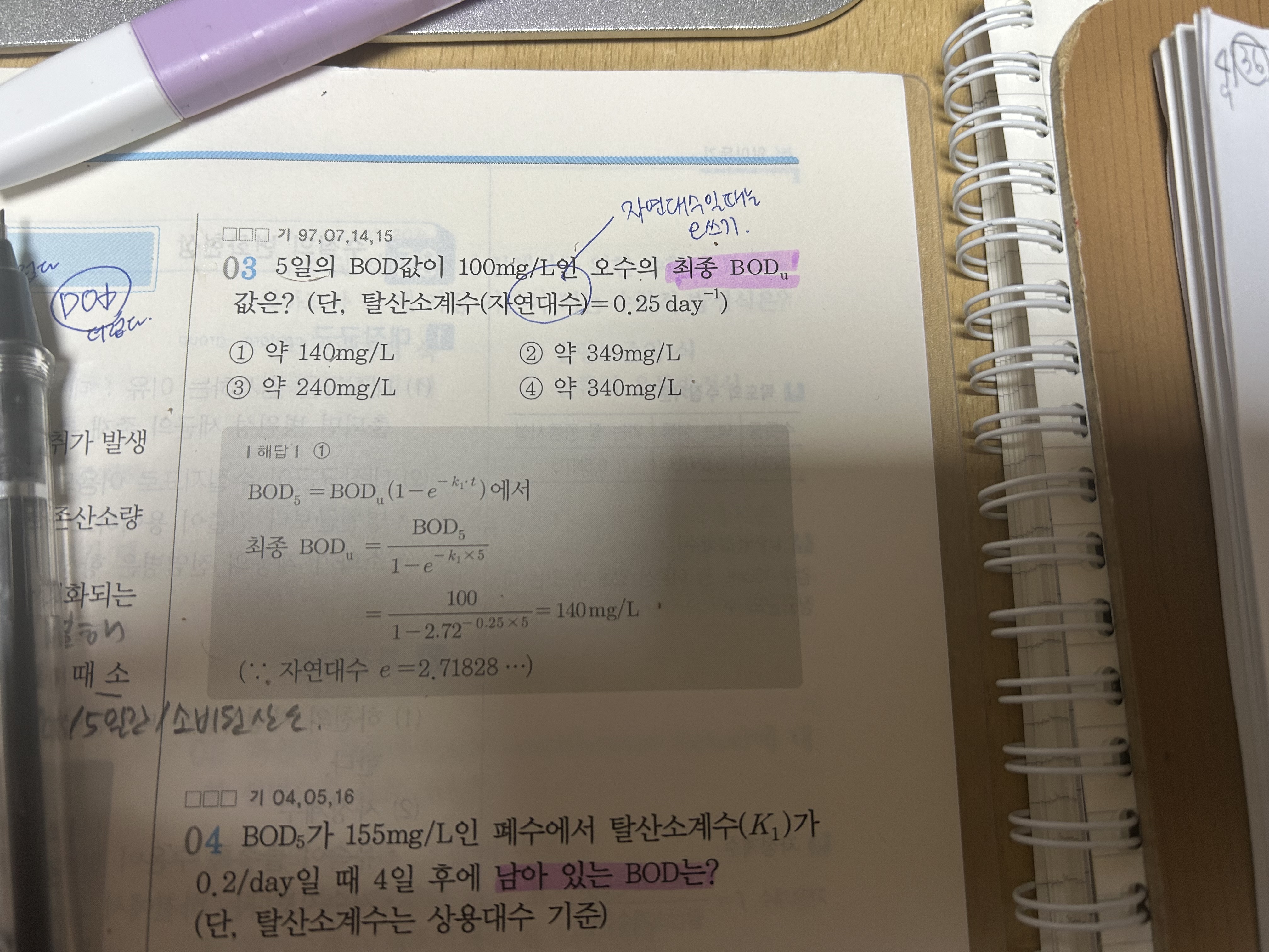 Bod5는 20°C에서 5일간 소비된 산소량을 의미하게 되므로 일반적인 BOD5는 소모량을 대입하여 풀이하게 되며 마지막 문제에서는 조건에 잔존량을 구하라고 했음으로 잔존량 공식에 대입하셔도 되고 아래의 해설과 같이 BODu-BOD4(4일간 소비된 산소량)로 풀이하셔도 무방합니다.
