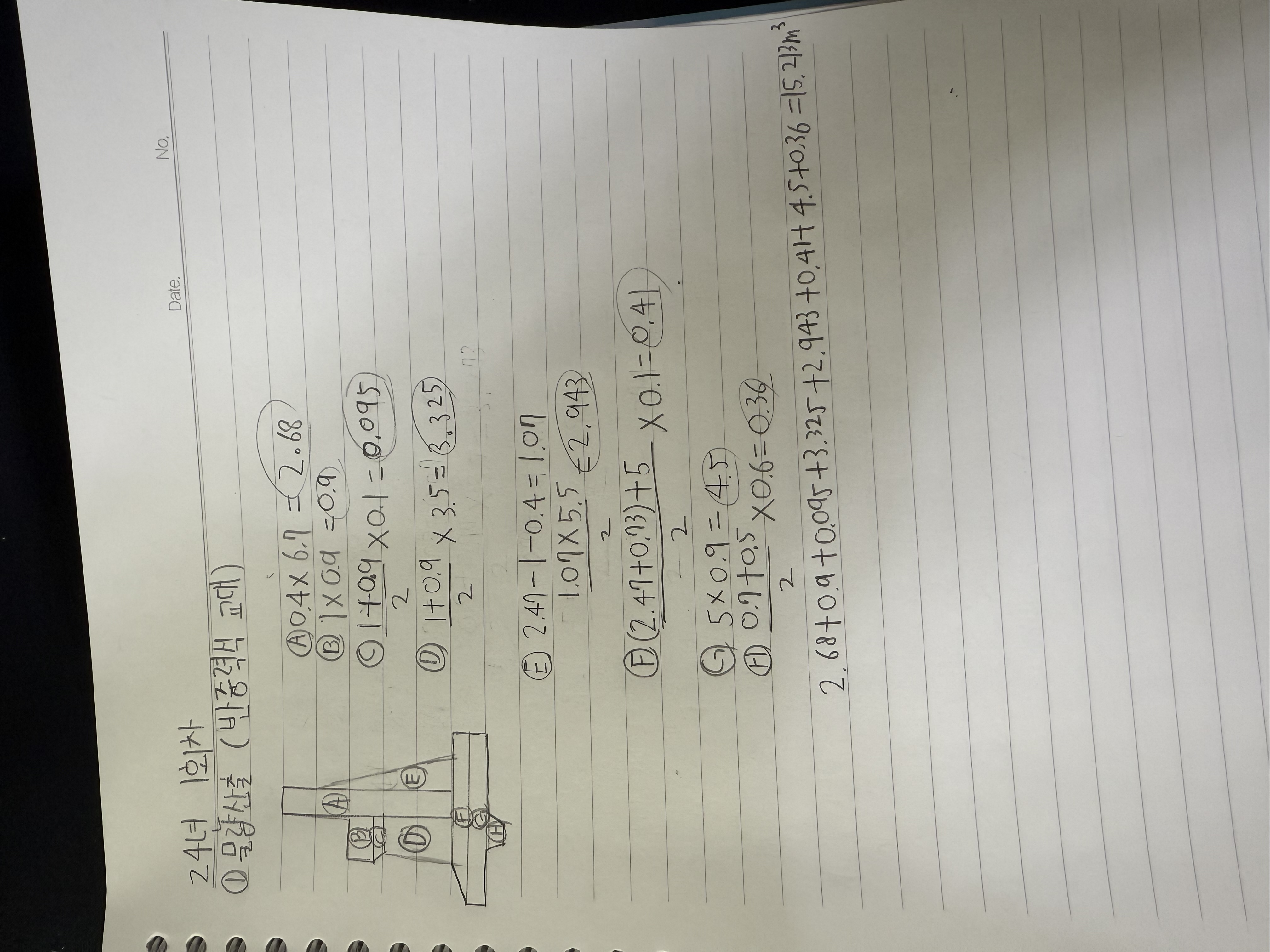 E 도형 산출 시 D 도형과 마찬가지로 기울기를 고려하셔서 산출하셔야 합니다.