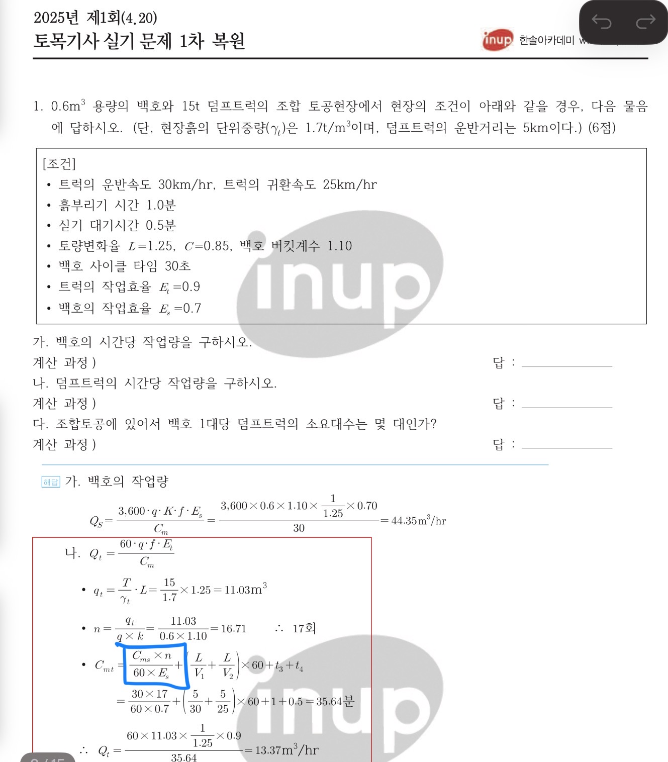 해당공식은 트럭의 사이클타임(Cm)계산시에만 적용되며, 문제에 적재시간 자체가 주어지거나 전체의 사이클 타임이 주어지는 경우는 고려하지 않고 작업량을 산정할 수 있습니다.