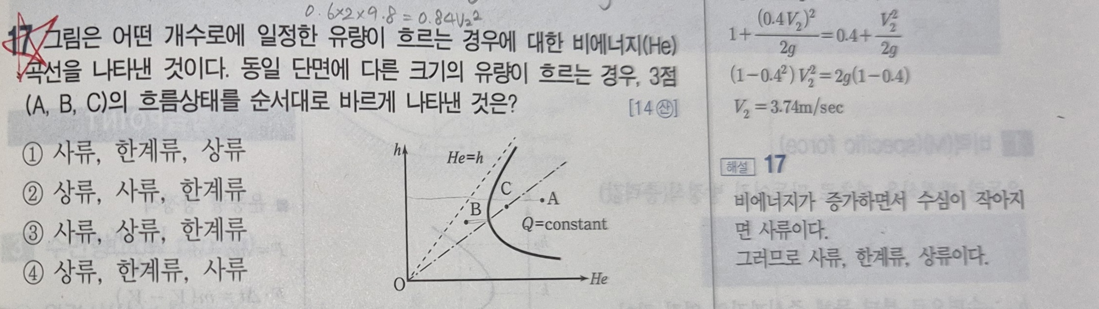 유량이 일정할 때 비에너지가 최소인 수심을 한계수심이라고 하며 한계수심보다 위쪽의 흐름은 상류, 아래쪽은 사류가 됩니다.