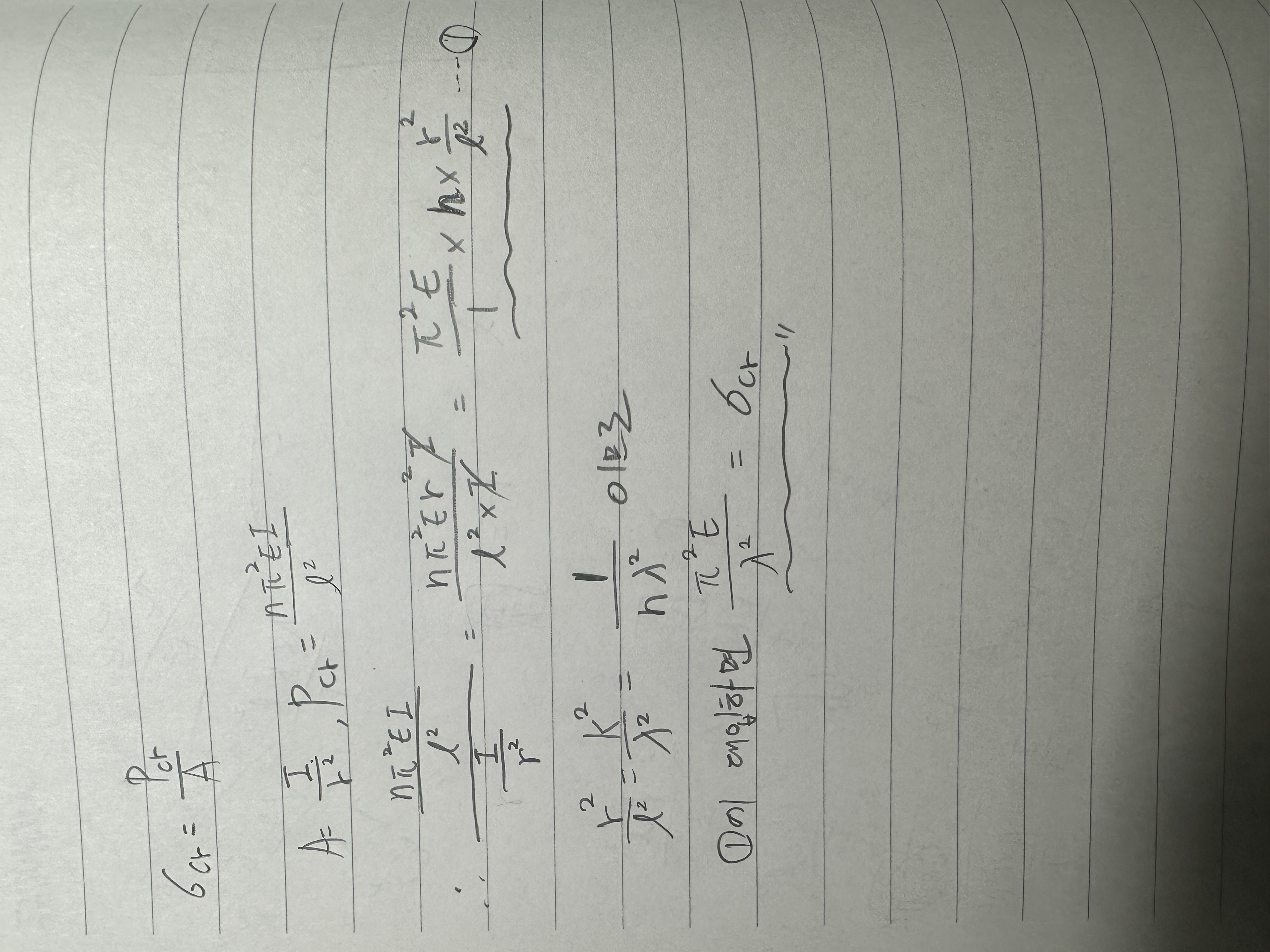 안녕하십니까 교수님책에 보면 좌굴응력이 (n*pi^2*E)/람다*2으로 나타나있는데좌굴하중/A 식을 정리해보면 n이 자꾸 약분이 되어서 사라지고 (pi^2*E)/람다*2라는 식이 나옵니다. 혹시 풀이과정에 제가 어떤 오류가 있는지 알려주시면 감사하겠습니다.사진에 풀이공식 첨부했습니다.