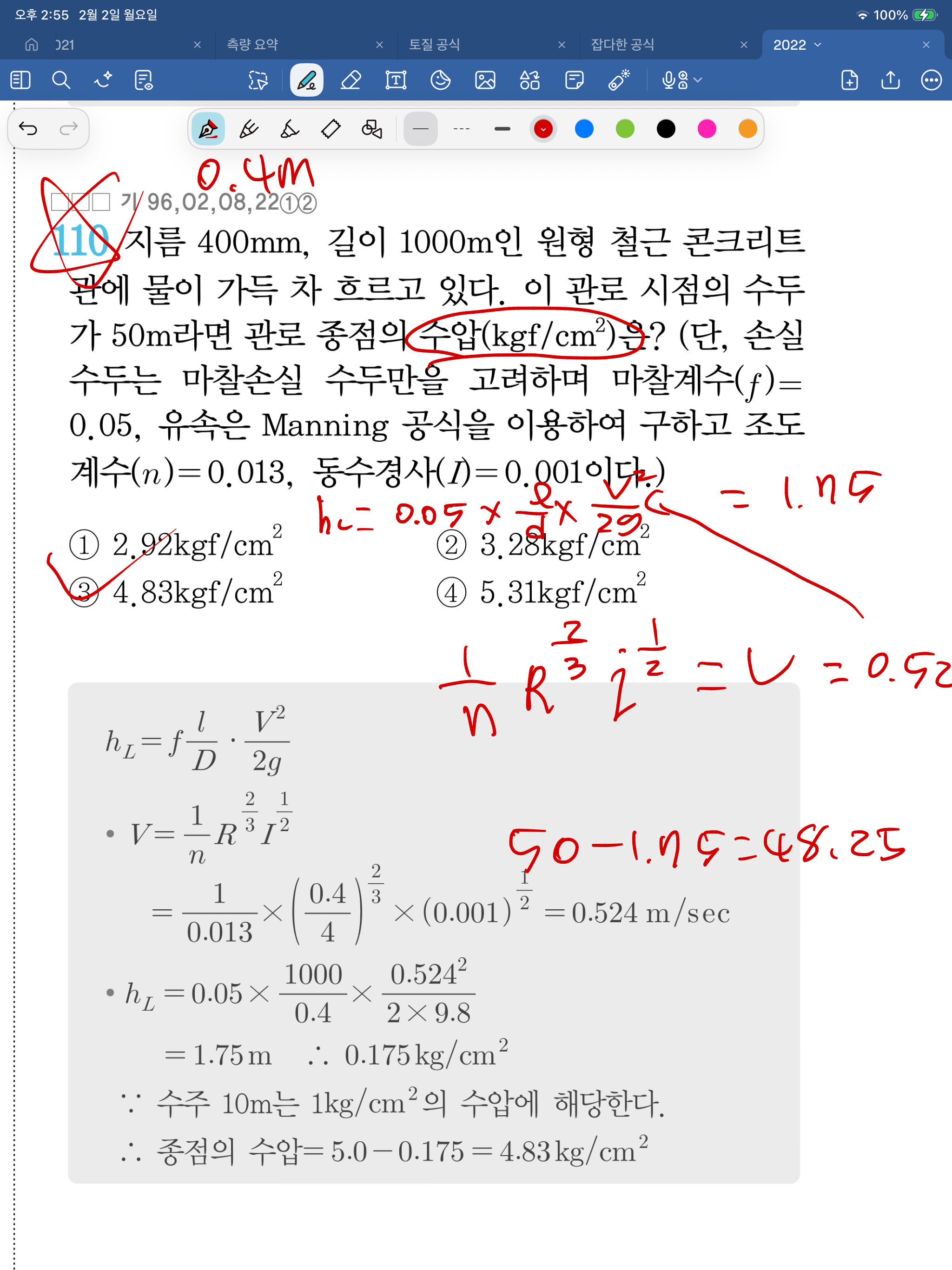 문제에서 유속은 manning공식을 이용하여 구한다는 조건이 있으므로 manning공식을 이용하여 유속을 구하고 이를 이용하여 손실수두를 계산하여야 합니다.