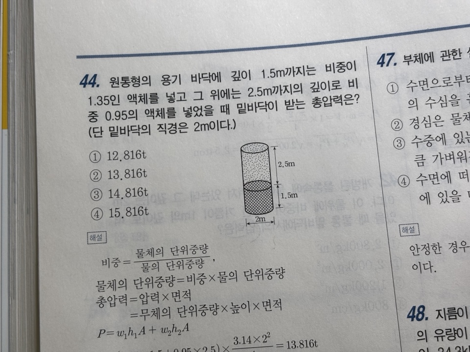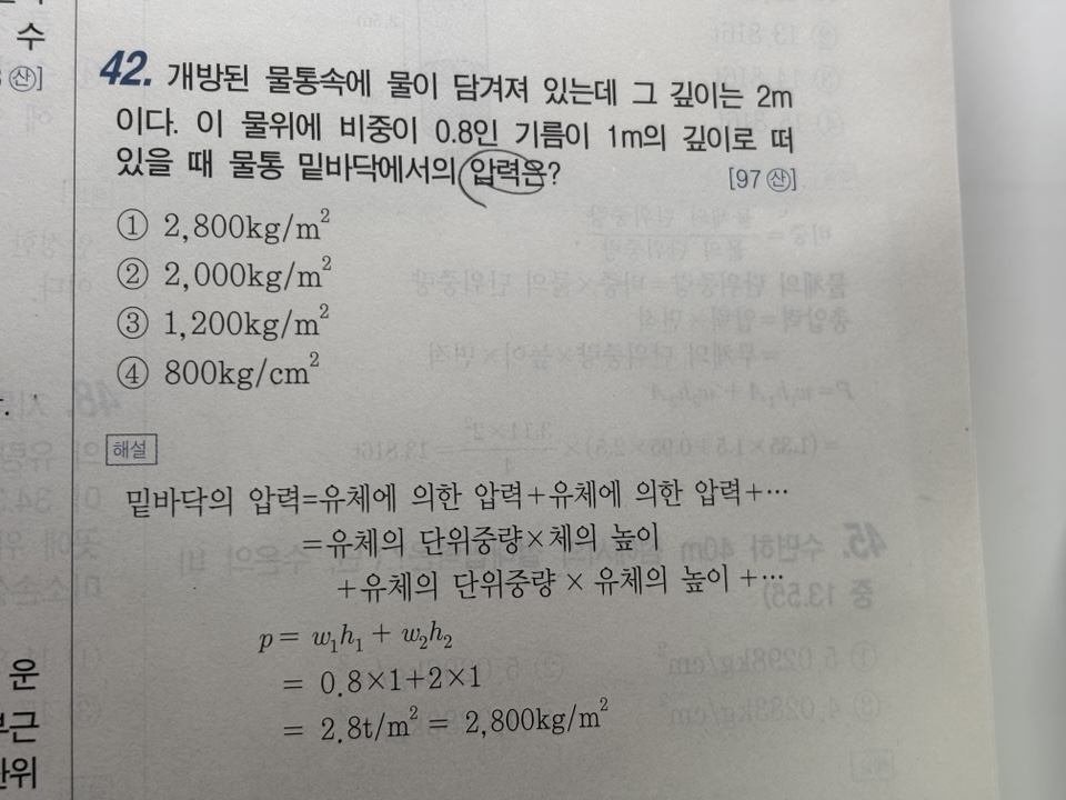42번 문제는 kg/m2으로 압력을 구하는 문제이며 44번문제는 t으로 압력에 면적을 곱해야 풀이할 수 있습니다.