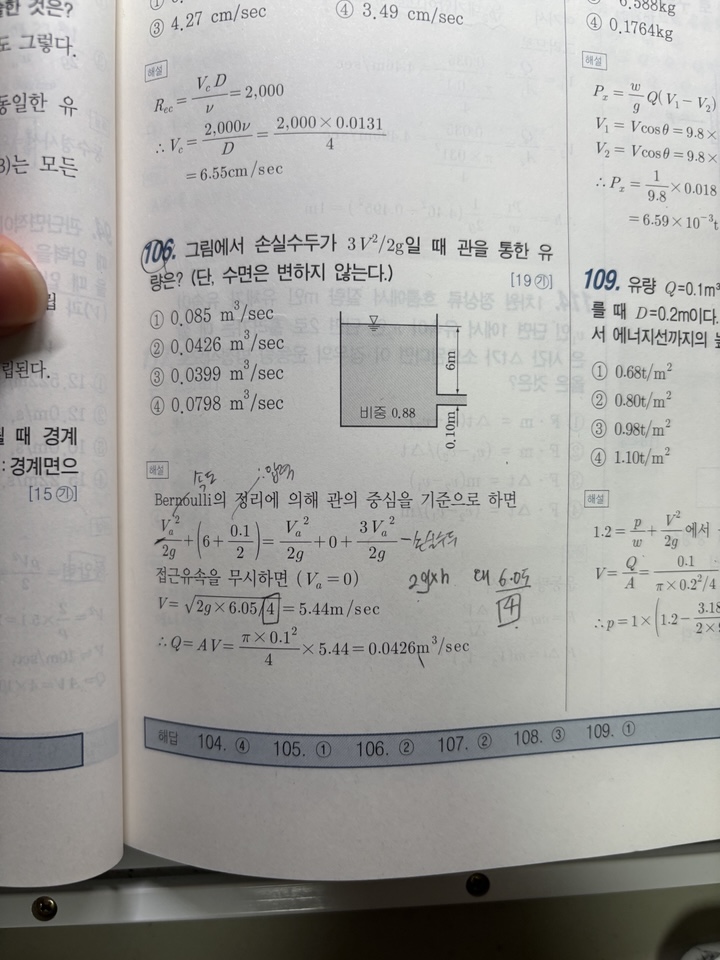6=V2/2g+3V2/2g이므로 식을 정리하면 4로 나누게 됩니다.