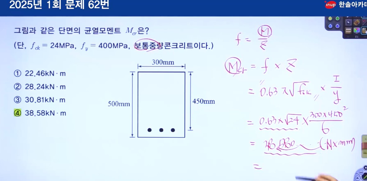 25년 1회차 62번 강의를 듣고 있었는데요! 강의에서 0.63x루트24x300x500제곱/6 아닌가요??