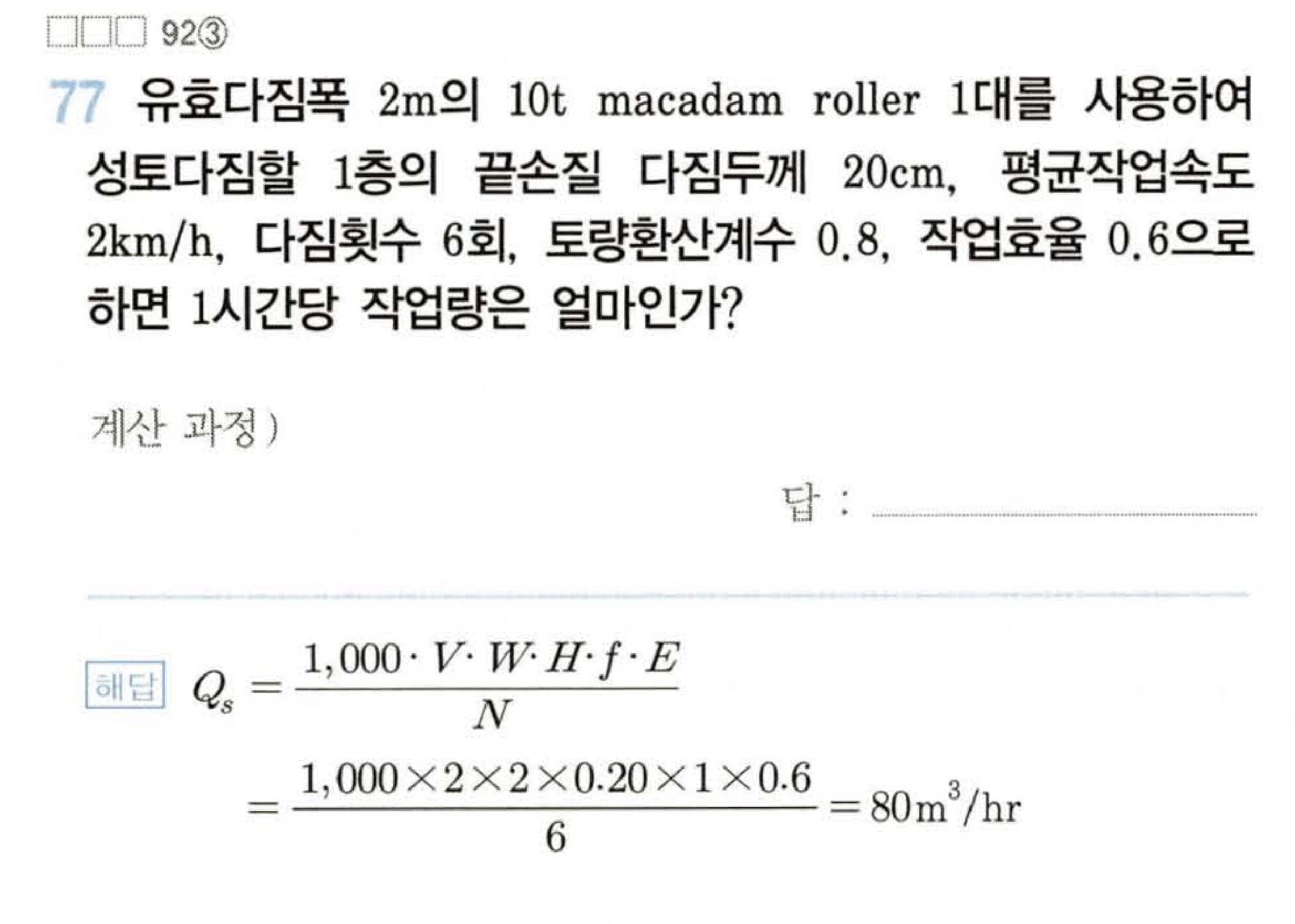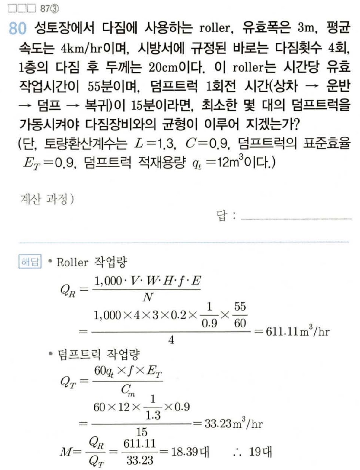 80번문제는 다짐후 두께가 주어져 있지만 트럭과의 작업을 고려하기 위해 자연 상태의 토량으로 산출하기 위해 1/C를 고려한 것입니다.