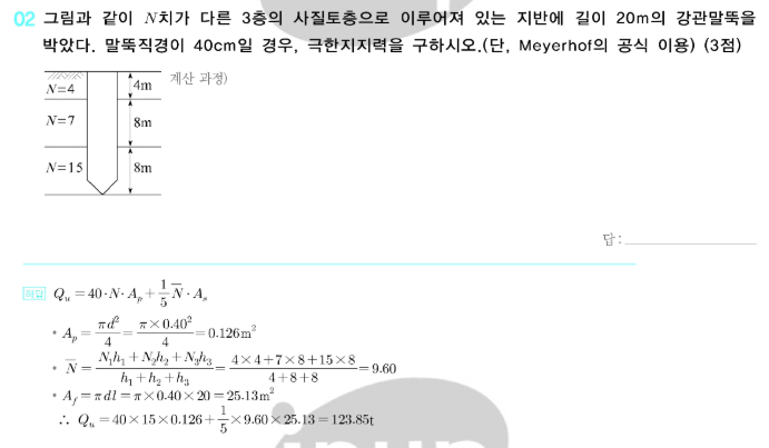 2023년도 1회차 2번에 극한지지력산출에 있어서 년도별 기출문제 답안에서 산식을 개별(123.85t)로 구한 답과 공식을 하나(123.65t)로 구한 답이 서로 상의 하여 문의 드립니다.