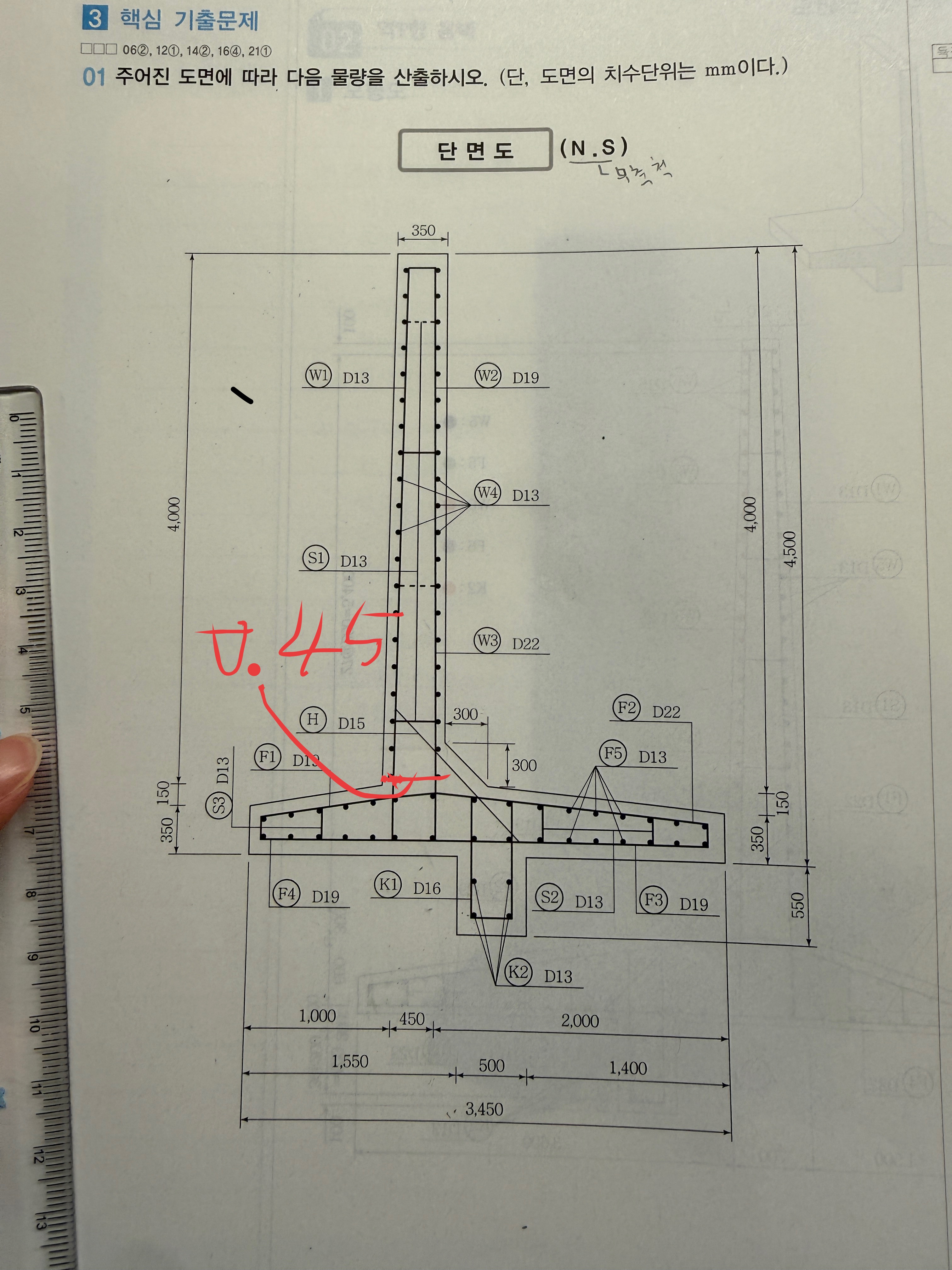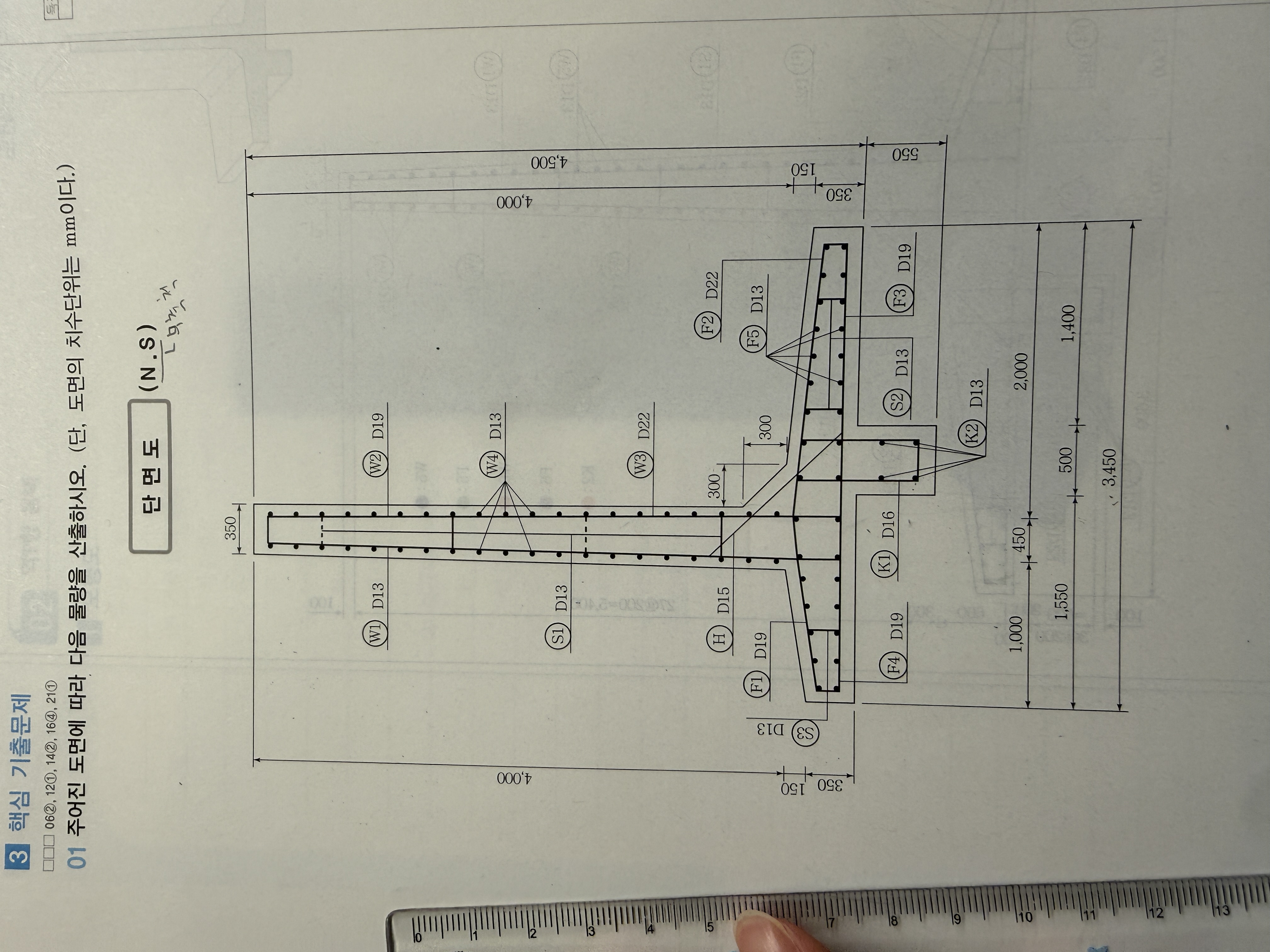 치수 기준이 이상한거같습니다. 문제대로면 철근과 철근사이가 450mm인거같아요. 다른문제들은 정확히 되있던데 이문제만 이상하네요. 이런문제에서는철근과 콘크리트 사이 간격이 기재가 안되어있으니 그냥 콘크리트 끝과끝으로 이해하면되는건가요?