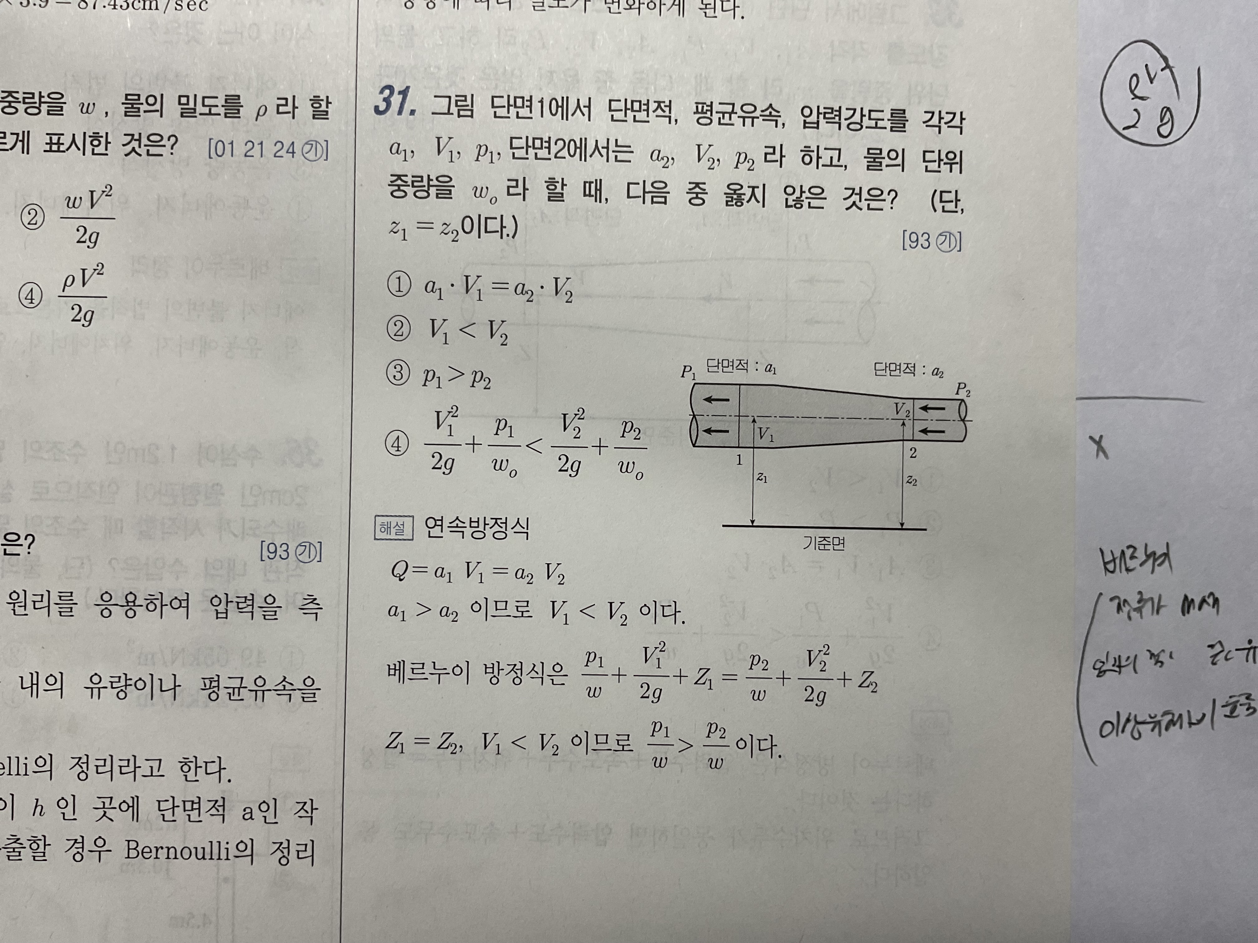 해설이 틀린거 같습니다. 위치수두가 같으니까 속도 + 압력수두는 서로 같아야 하는거 아닌가요? 뒤에 33번 해설은 같아야 한다고 나왔습니자
