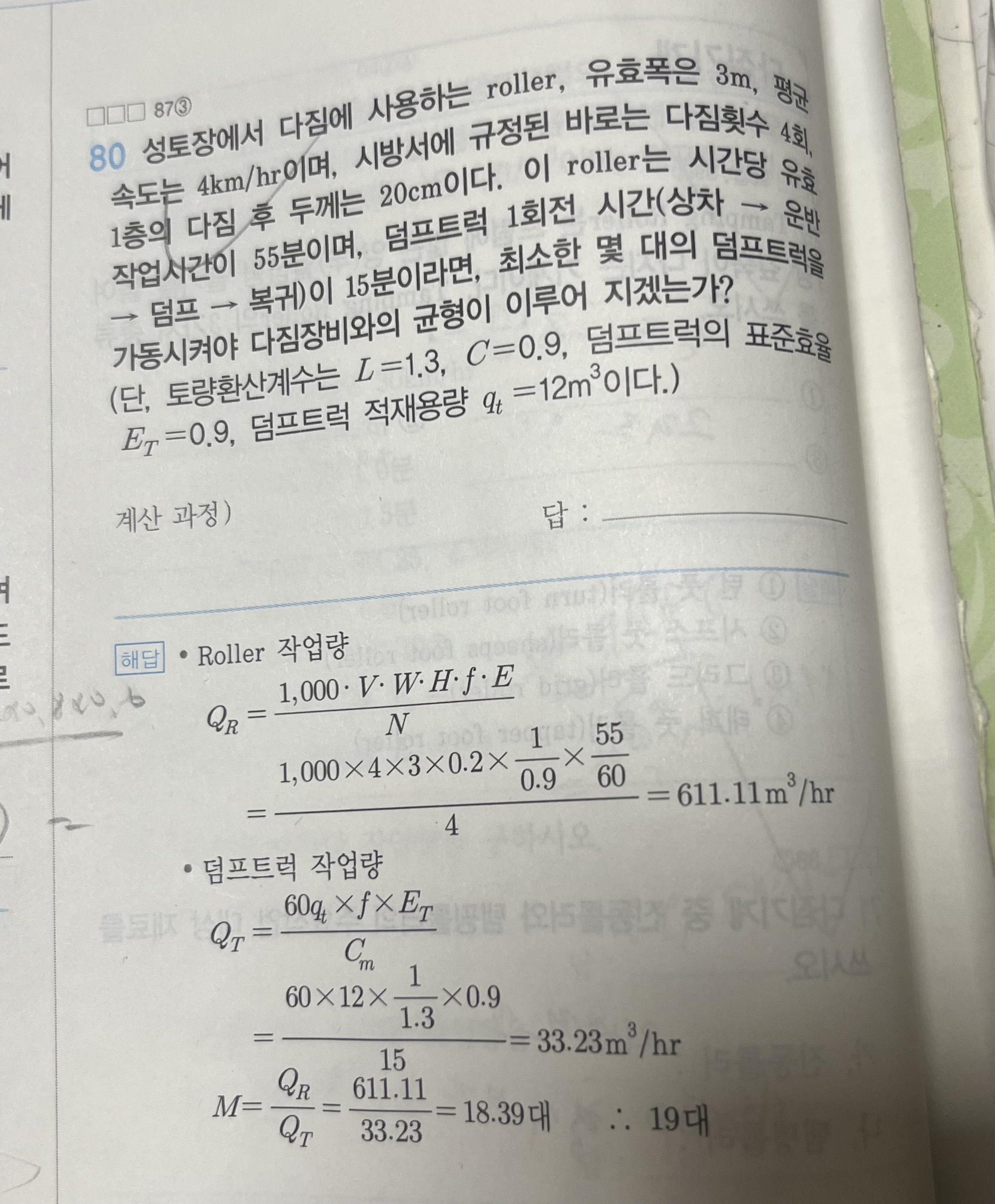 하지만, 해당문제는 트럭과의 조합작업을 고려하여 작업량을 산출해야 하기 때문에 롤러의 작업량을 본바닥로 표현하기 위해 1/C를 고려한 것입니다.