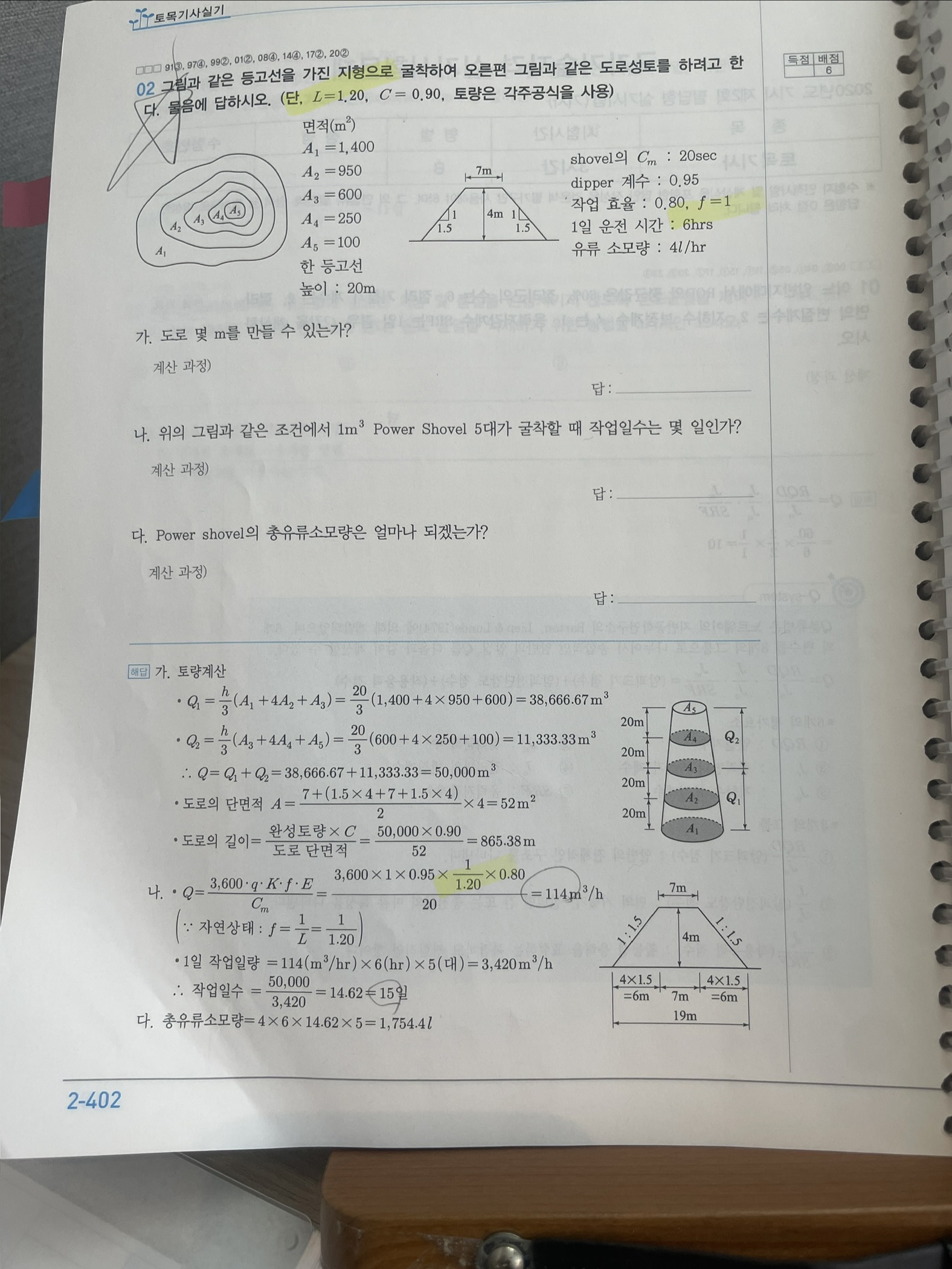 문제에 주어진 토량환산계수(f=1)는 쇼벨의 토량환산계수라고 주어졌습니다만, 그대로 적용하면 작업량이 느슨한 상태로 계산되며, 토공량을 느슨한 상태(50000xL)로 적용하여 작업일수를 계산하여야 합니다.