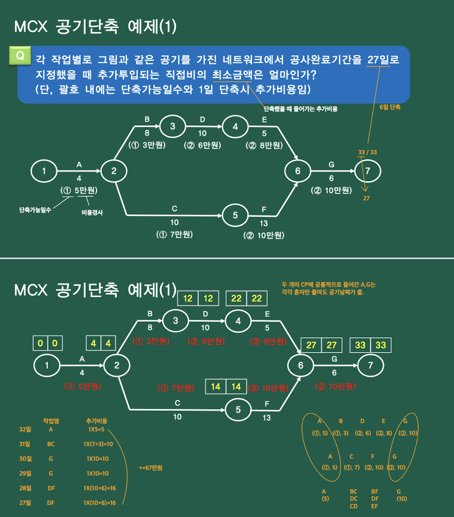 강의 중 해당 문제에 대해 답안에 단계(일 수 ) / 단축작업 / 단축일수 / 추가비용 으로 구성된 표를 작성하셨던 걸로 기억합니다