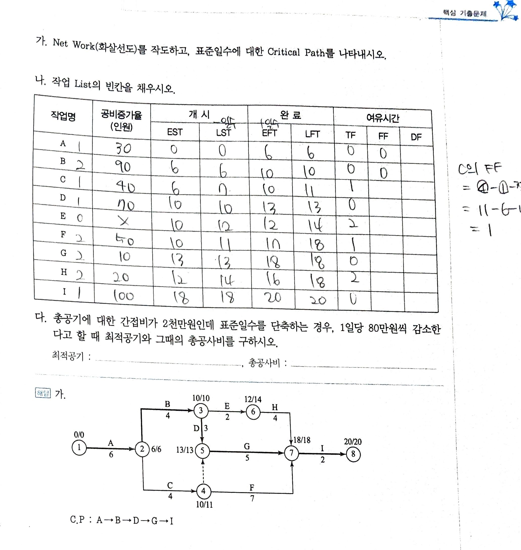 FF를 구할때 4-1-절인 경우는 실선없이 더미 하나만 나가는 경우(넘버링더미)입니다. 따라서 해당 공정표는 FF작업을 전부 3-1-절로 풀이하시면 되겠습니다.
