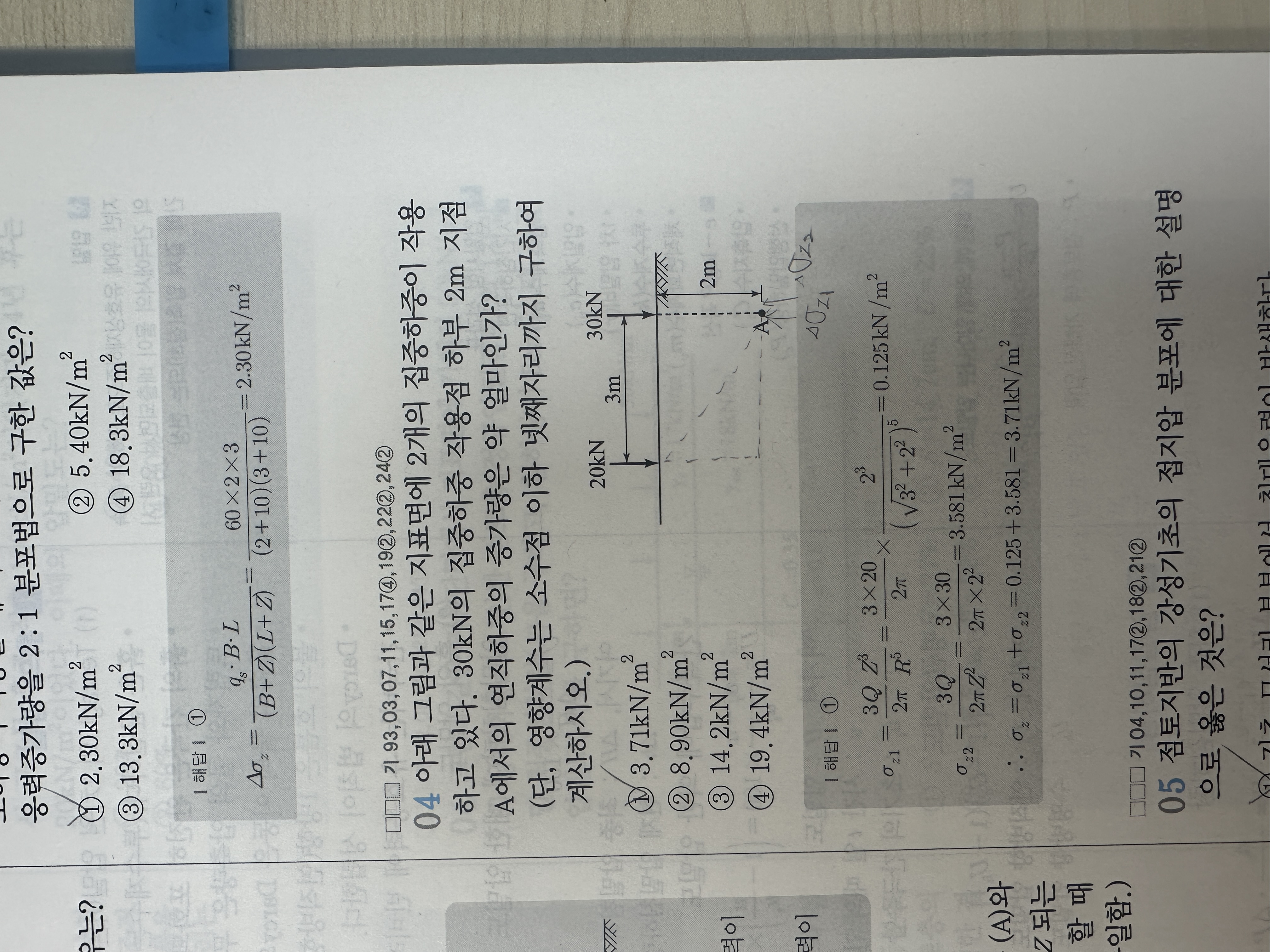 합력(Q):50kN, 합력과 30kN사이의 거리(r):1.2m, Z=2m 를 델타응력z1 식에 대입한 값(약 2.77)이 책의 답과 다르게 나오는 이유를 알고싶습니다!