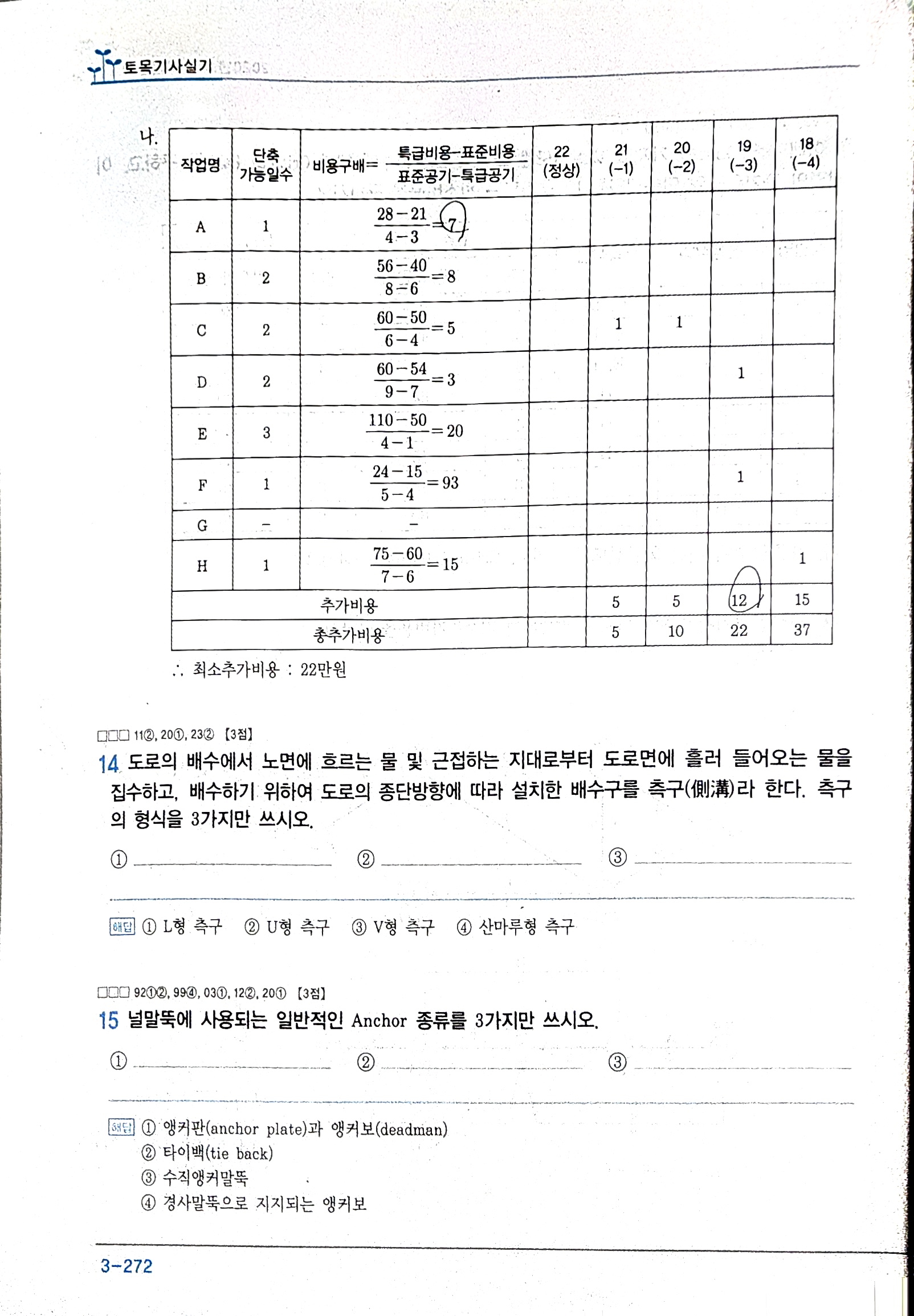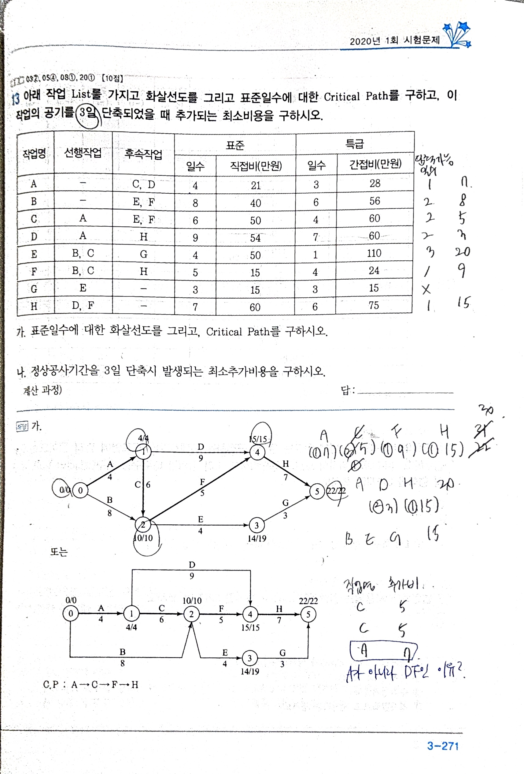 C작업을 2일 단축하고 나면 ADH, BFH경로의 sub CP가 발생하게 되므로 다음 단축작업을 고려할때는 ACFH, ADH, BFH경로에서 비용경사가 가장 적은 DF작업을 단축하여야 합니다.