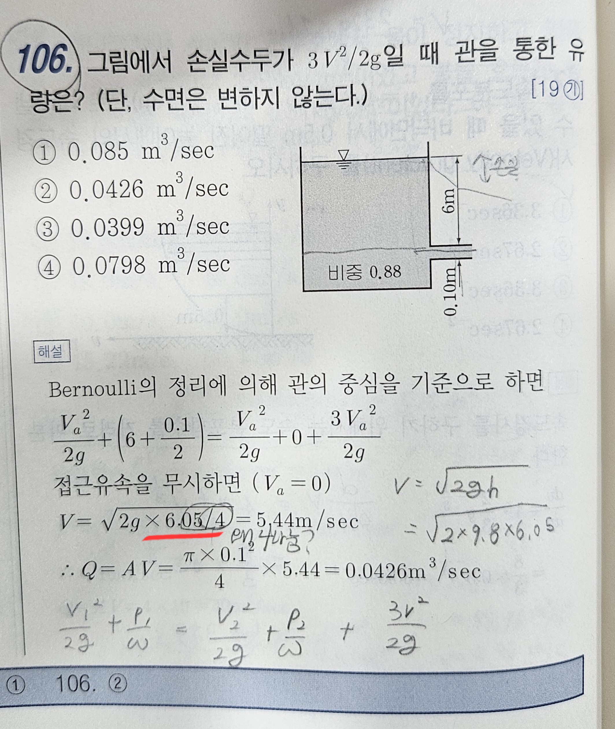 수면을 1번 지점, 물이 나오는 관의 중심을 2번지점으로 하여 관의 중심을 기준으로 베르누이방정식을 적용하면