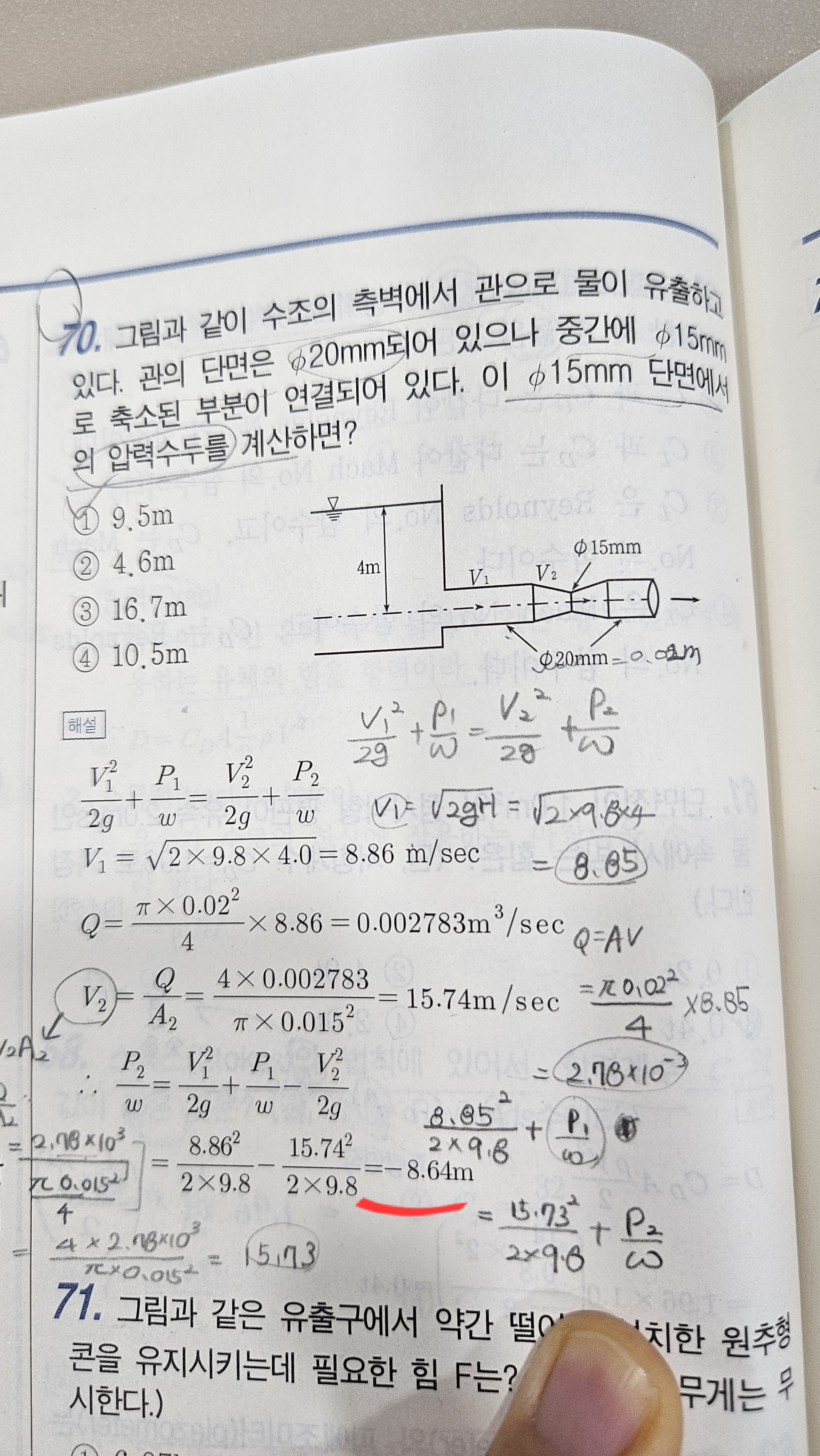 수면을 1번 지점, 직경 20mm 2번지점, 직경 15mm 3번지점으로 놓고 확인하게 되면 교재의 해설과 같이 토리첼리 정리를 이용하여V2=8.86m/s, 연속방정식을 적용하여 V3=15.74m/s 가 나오게 됩니다.